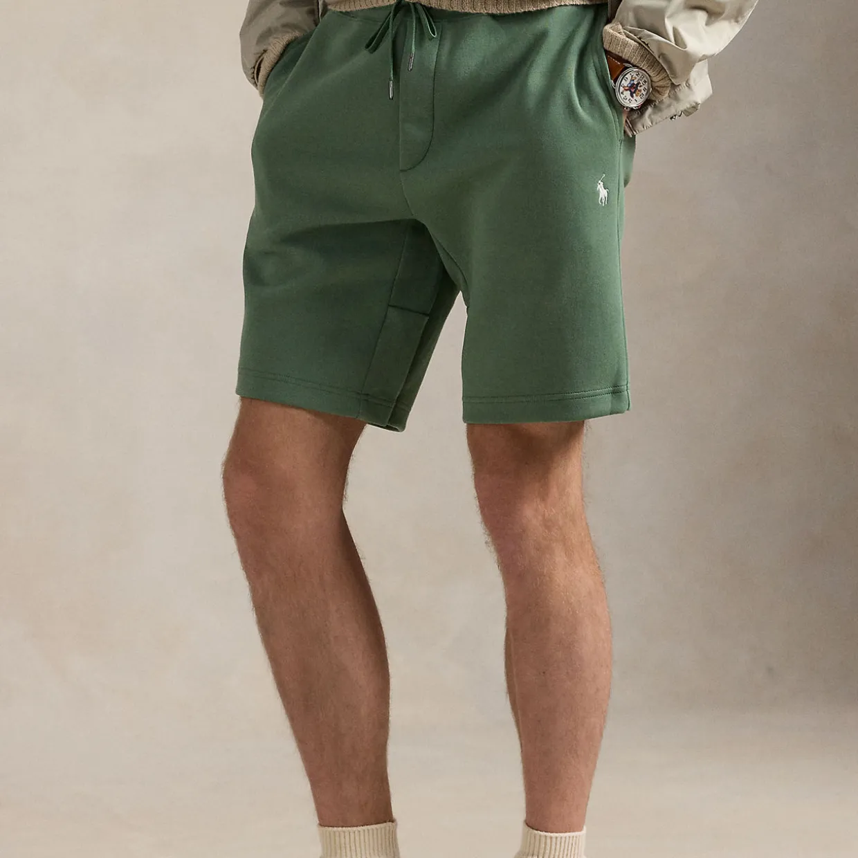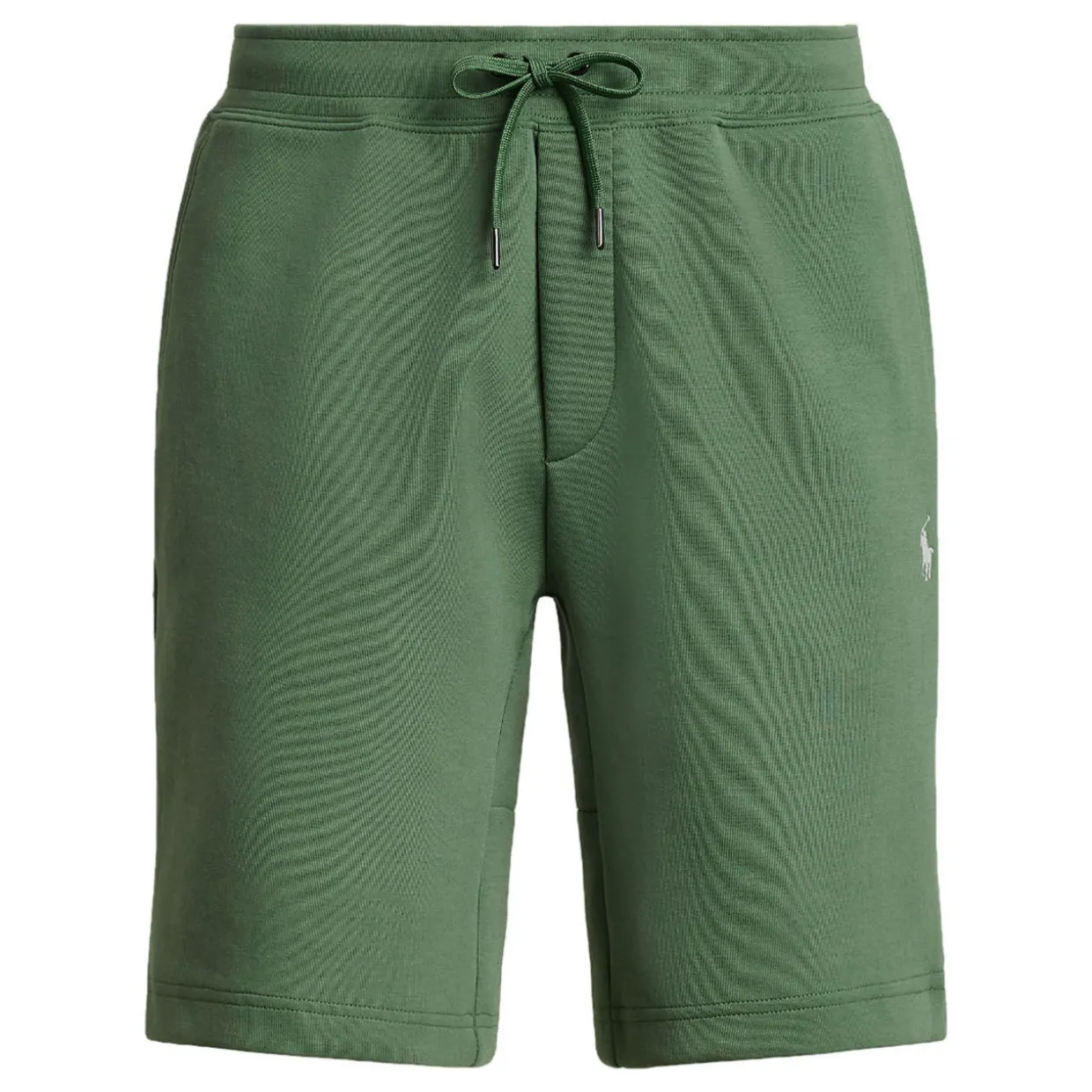 - Elasticated drawstring waistband, sewn fly, two front angled pockets, back right patch pocket, signature embroidered pony at the left hip