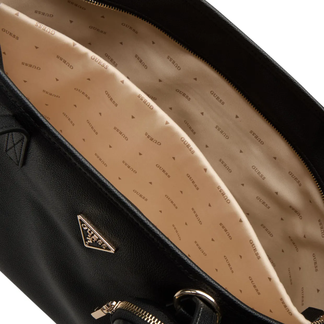 - Two top carry handles, secure zip-fastening closure, front triangle logo plaque, attached pouchette with logo lettering, back zip-fastening pocket