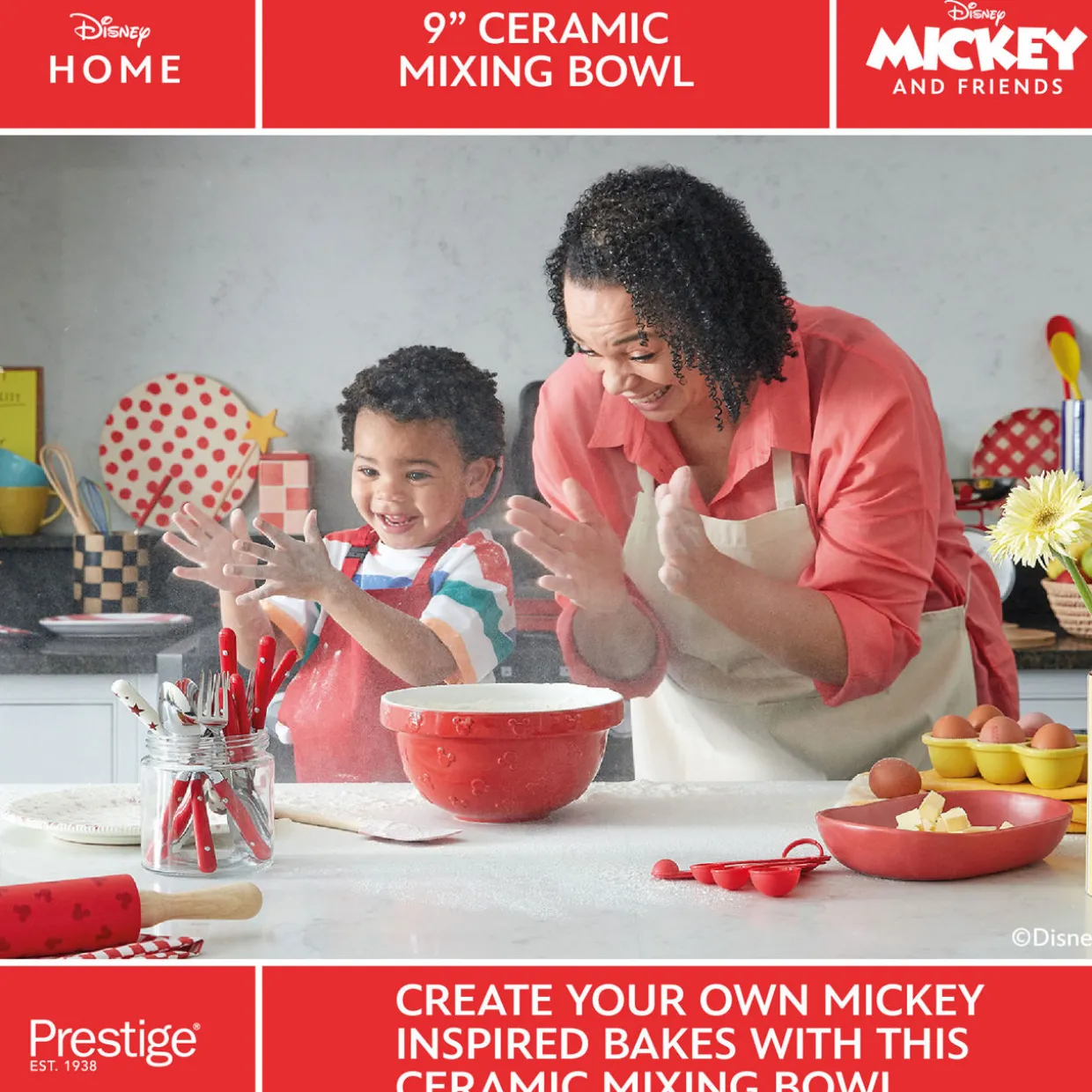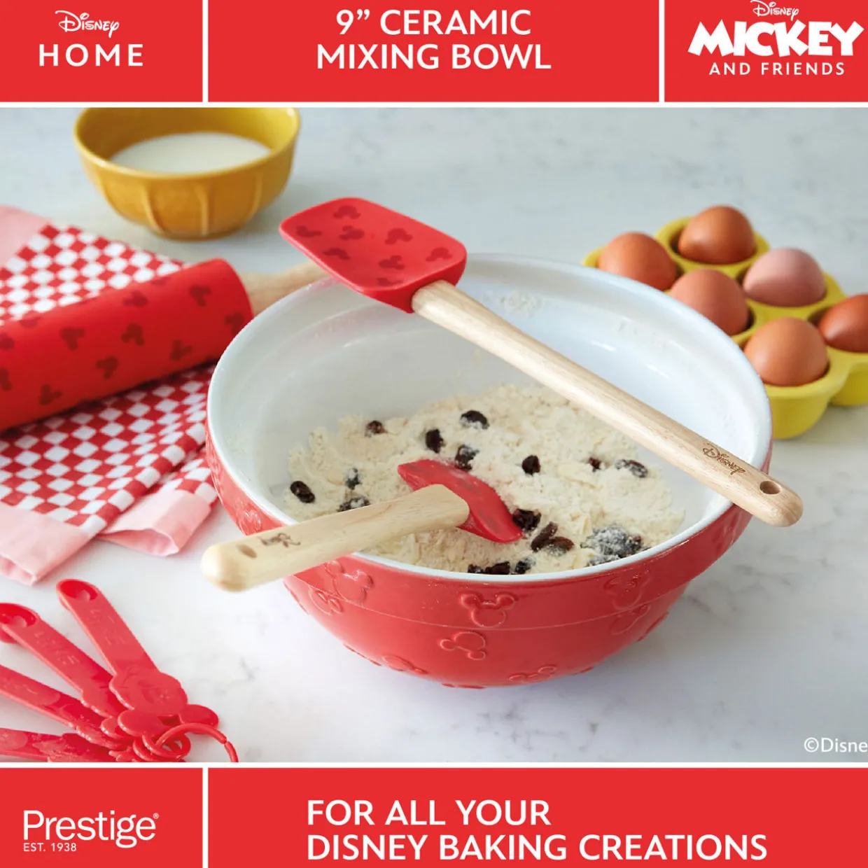 - The Prestige X Disney Bake with Mickey Ceramic Mixing Bowl is a delightful addition to your kitchen. It is a red ceramic mixing bowl that features an embossed Mickey head pattern externally, with a smooth interior. The bowl has a stepped rim with a pattern that is designed for better grip during mixing. The dimensions of the bowl are 23cm x 12cm.