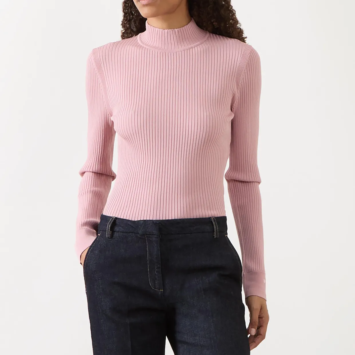 - Mock neckline, long sleeves, logo detail on cuffs, pullover style, ribbed-knit finish