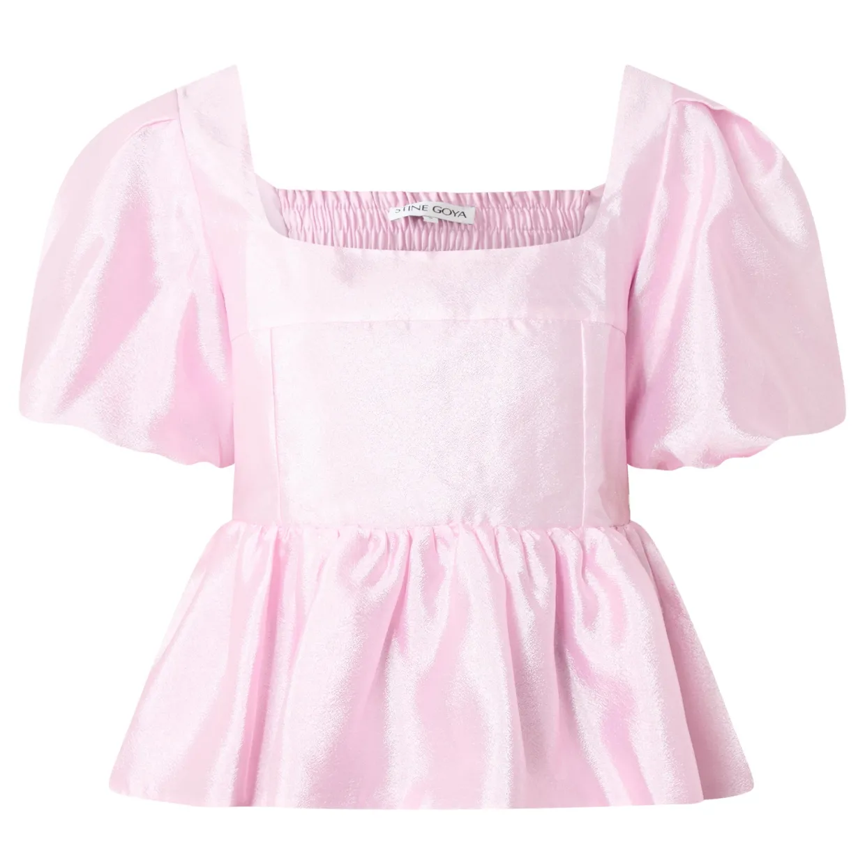 - Square neckline, short puff sleeves, peplum hemline, shirred back panel, concealed zip fastening