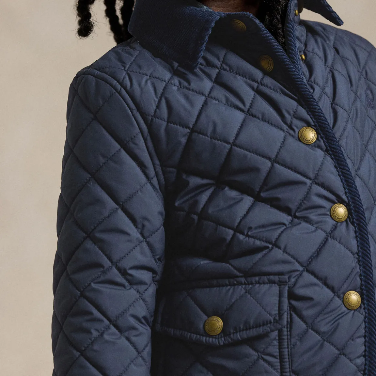 - Water-repellent shell, lightweight fill, corduroy trim, signature embroidered Pony logo, button-off hood, corduroy point collar, snapped placket, long sleeves, snapped cuffs, two front waist snapped pockets, princess seams at the back, shirred back waist, signature name tag label at the interior, fully lined, filled