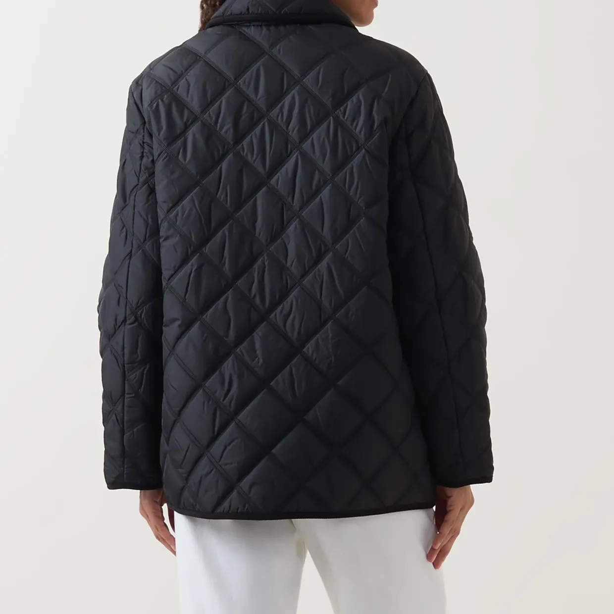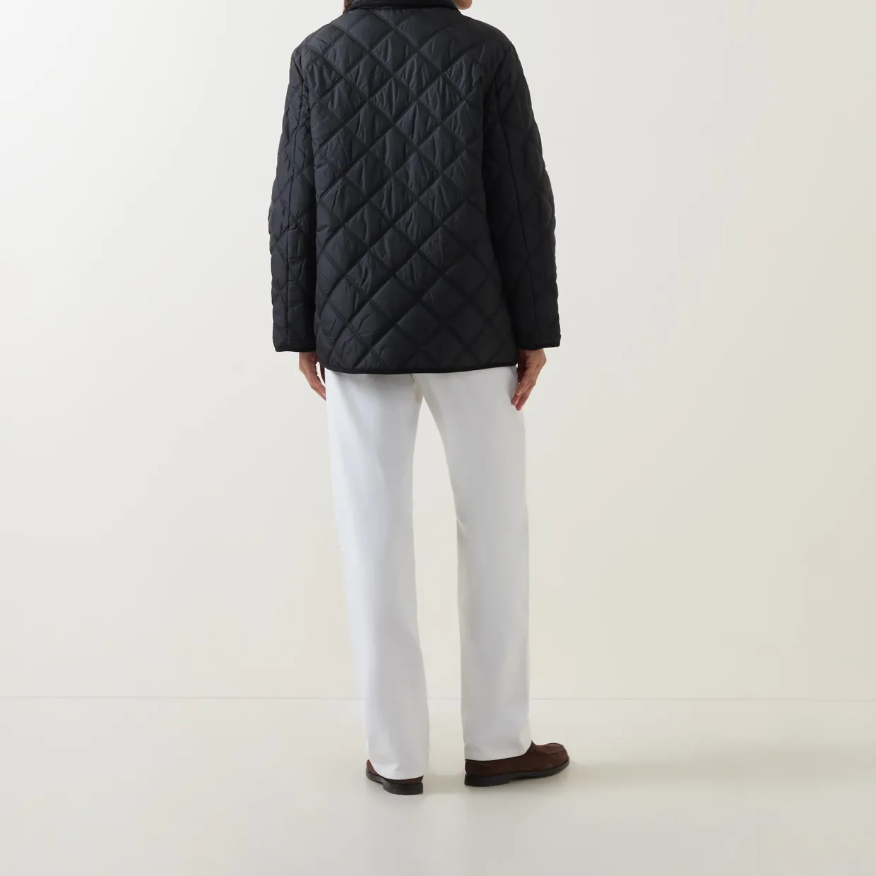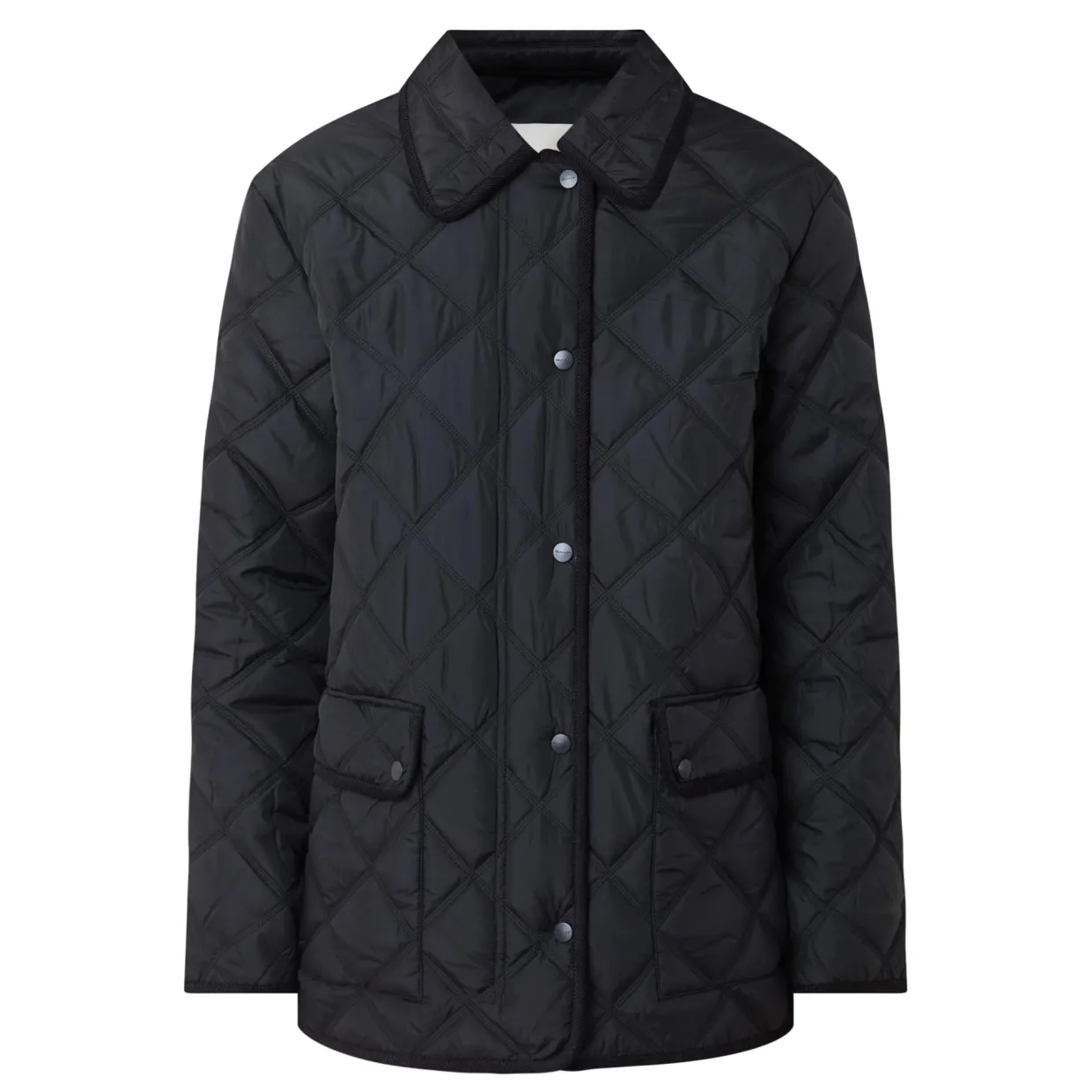 - Point collar, long sleeves, front zip fastening, additional snap button placket, two front flap pockets with snap button fastenings, straight hem, corduroy trim detailing, quilted design