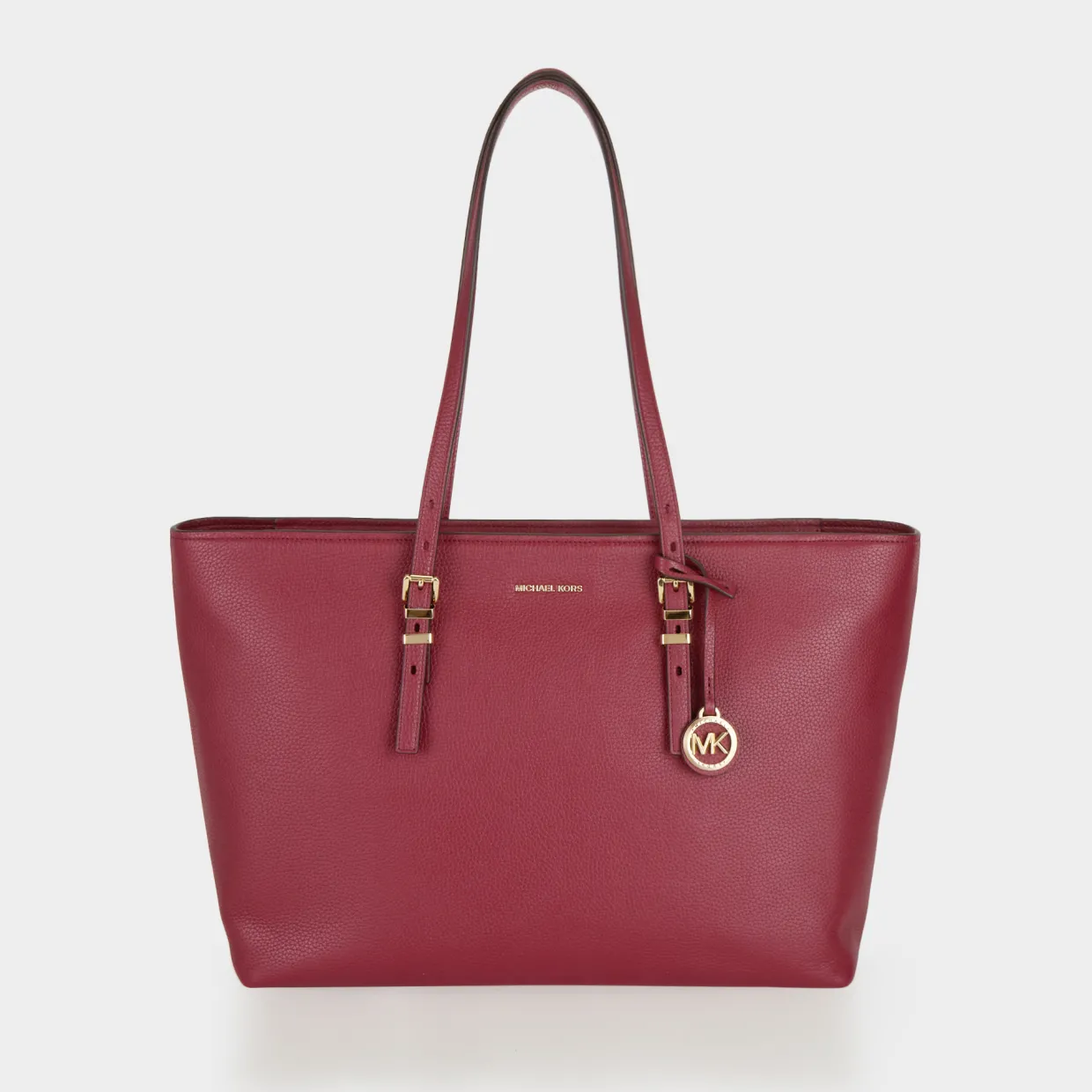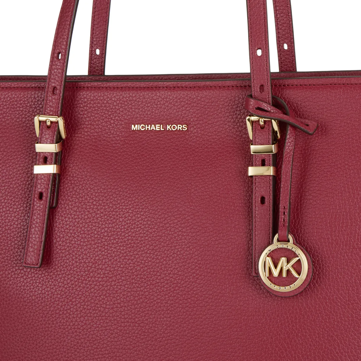 - Adjustable shoulder straps with buckle fastenings, top zip closure, one rear slip pocket, logo lettering, gold-tone hardware, hanging MK logo charm, tonal stitching, pebbled leather finish