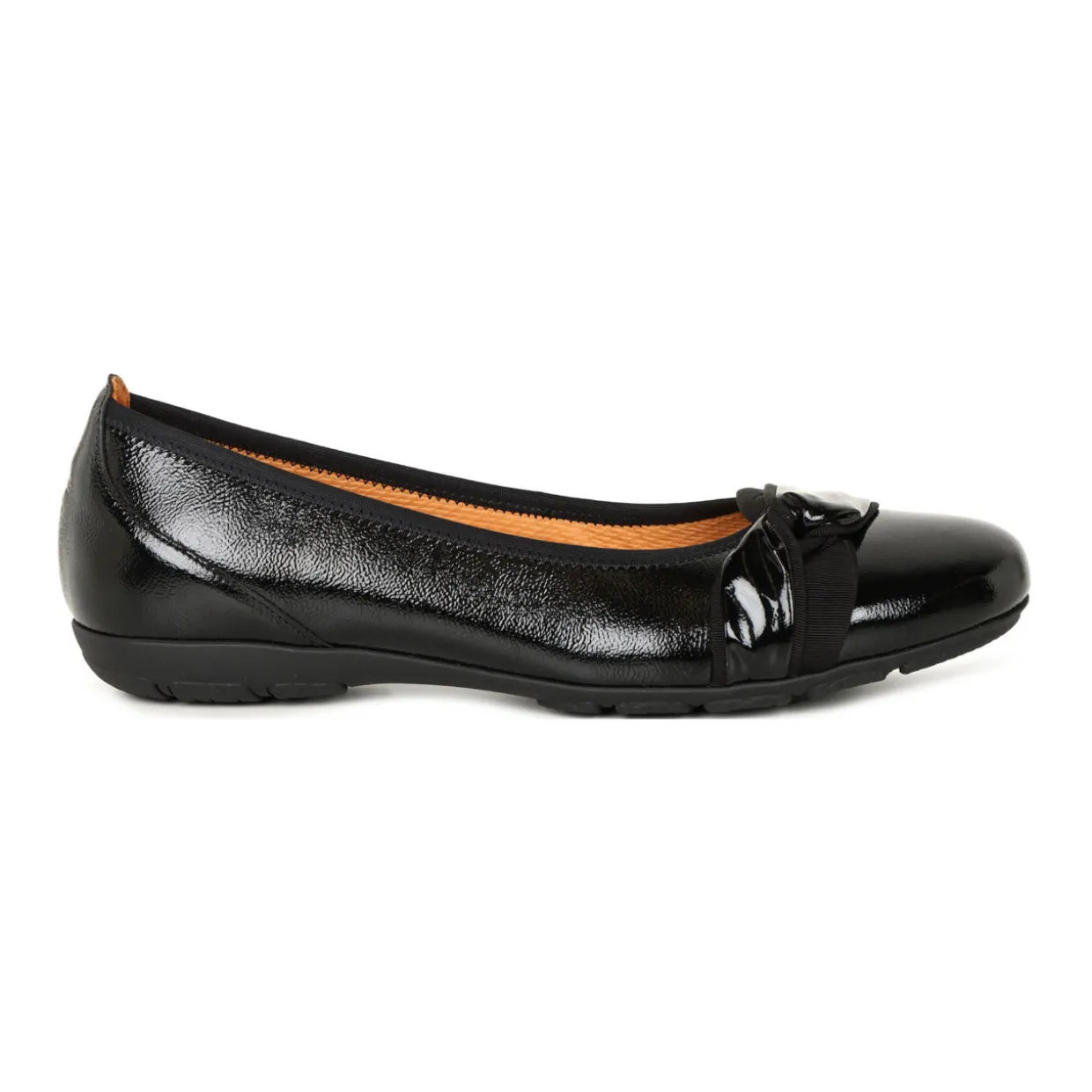 - UK C+ Standard (Gabor F), slip-on style, twisted bow detail, shiny patent leather finish