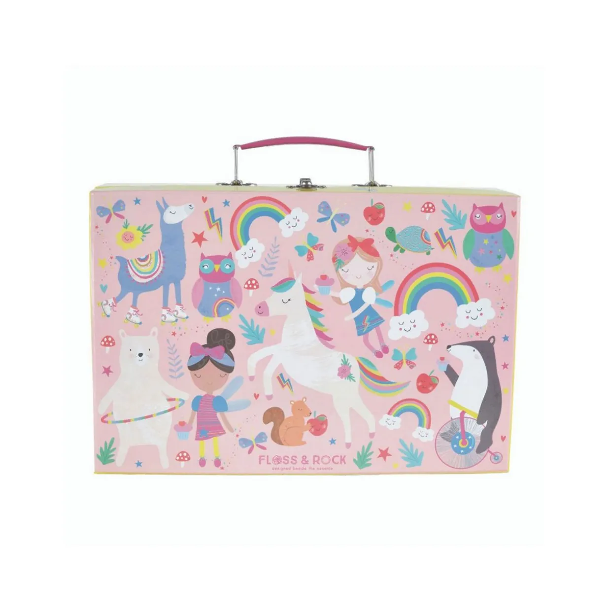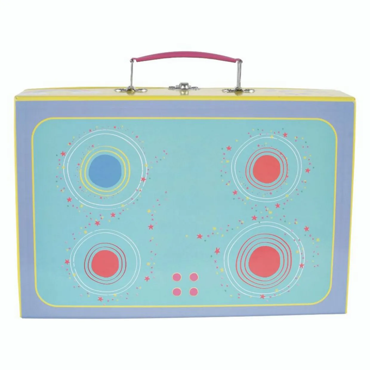 - 12-piece set, ‘Rainbow Fairy’ themed illustrations, one musical teapot, plays ‘Over the Rainbow’ song, two cups, two saucers, two plates, one oven dish, one pan, one whisk, one spatula, box with carry handle