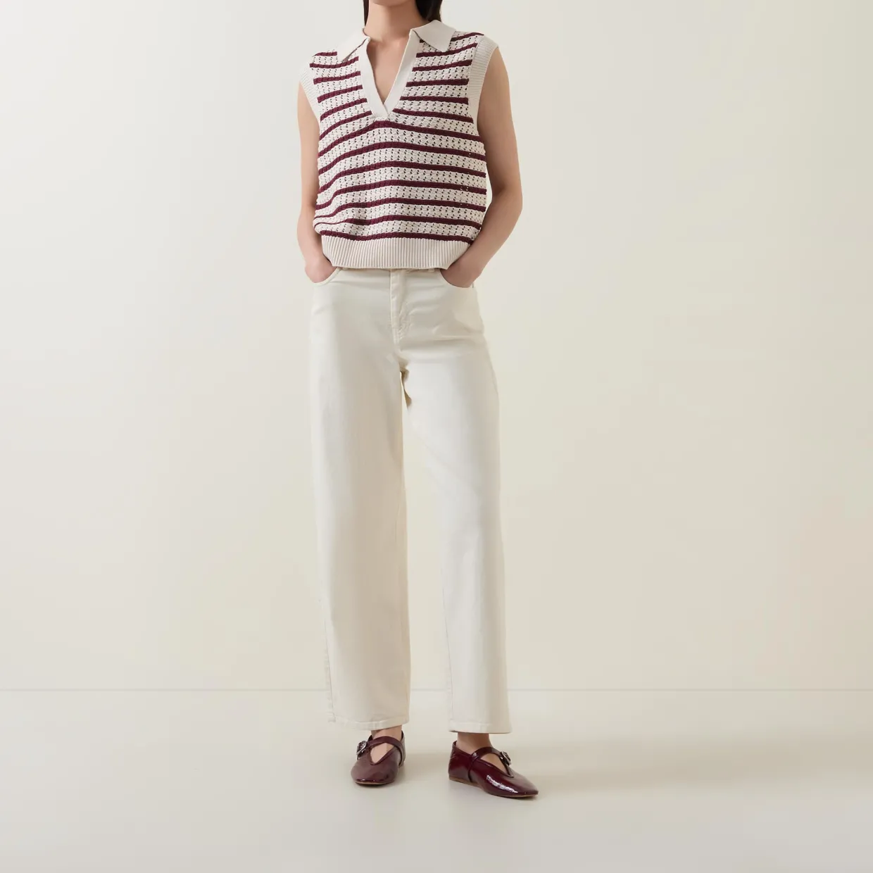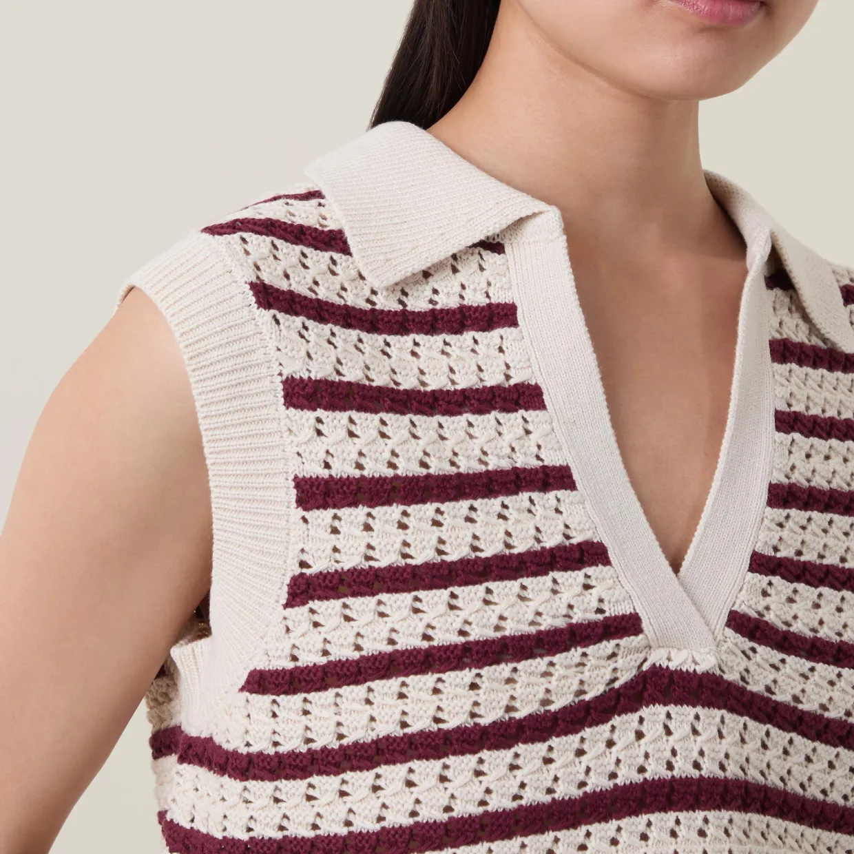 - Striped, open knit, polo collar, sleeveless, straight hemline