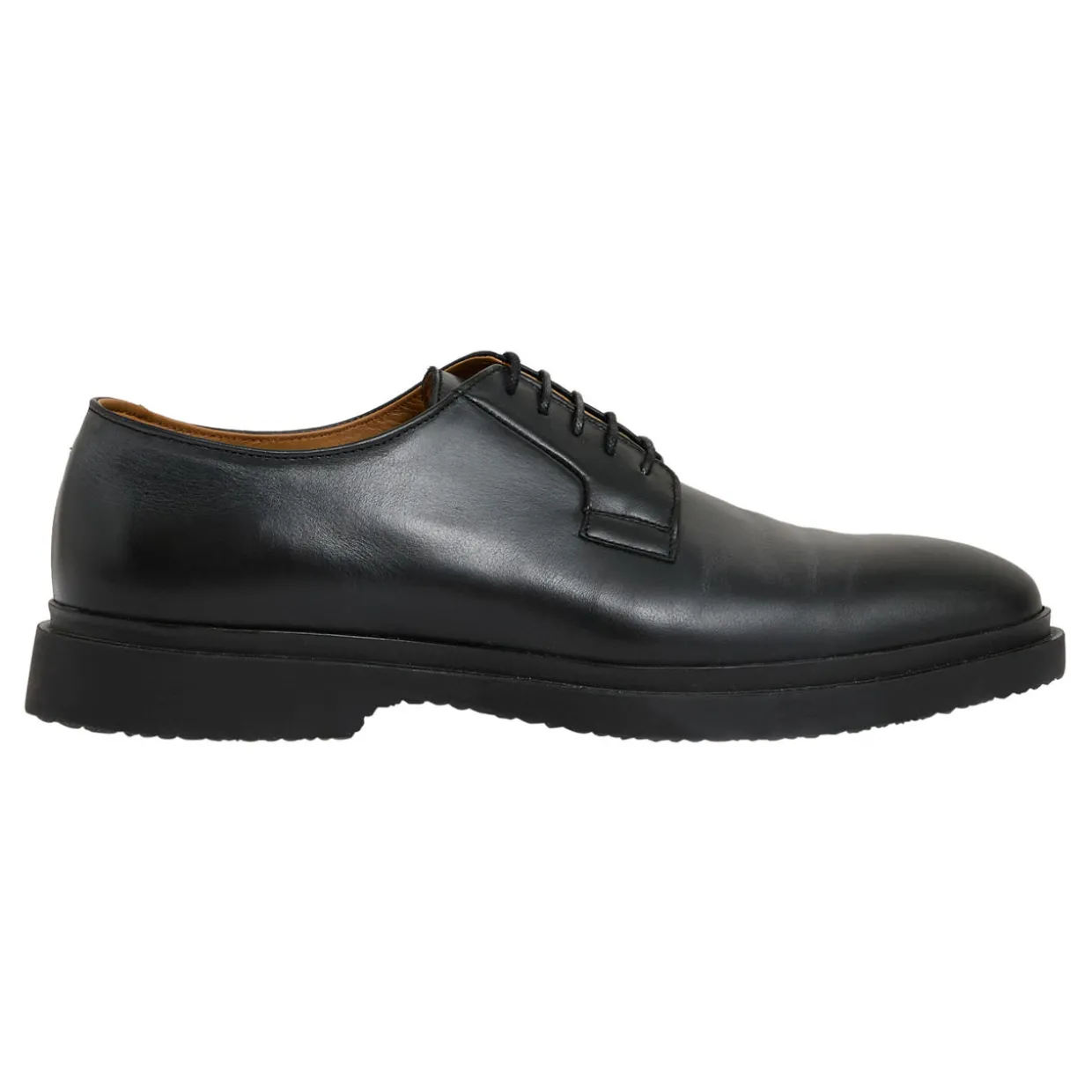 - Smooth leather, rounded toe, open lacing system, Goodyear welt, rubber sole