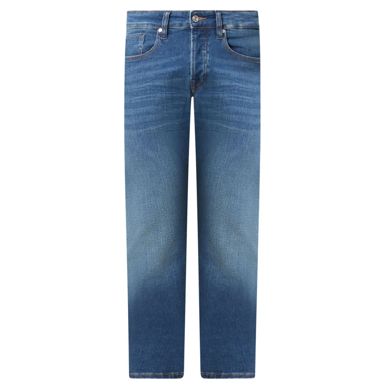 - Slim straight leg, mid-rise waist, five-pocket detail, zip fly and button fastening, belt loops, logo patch