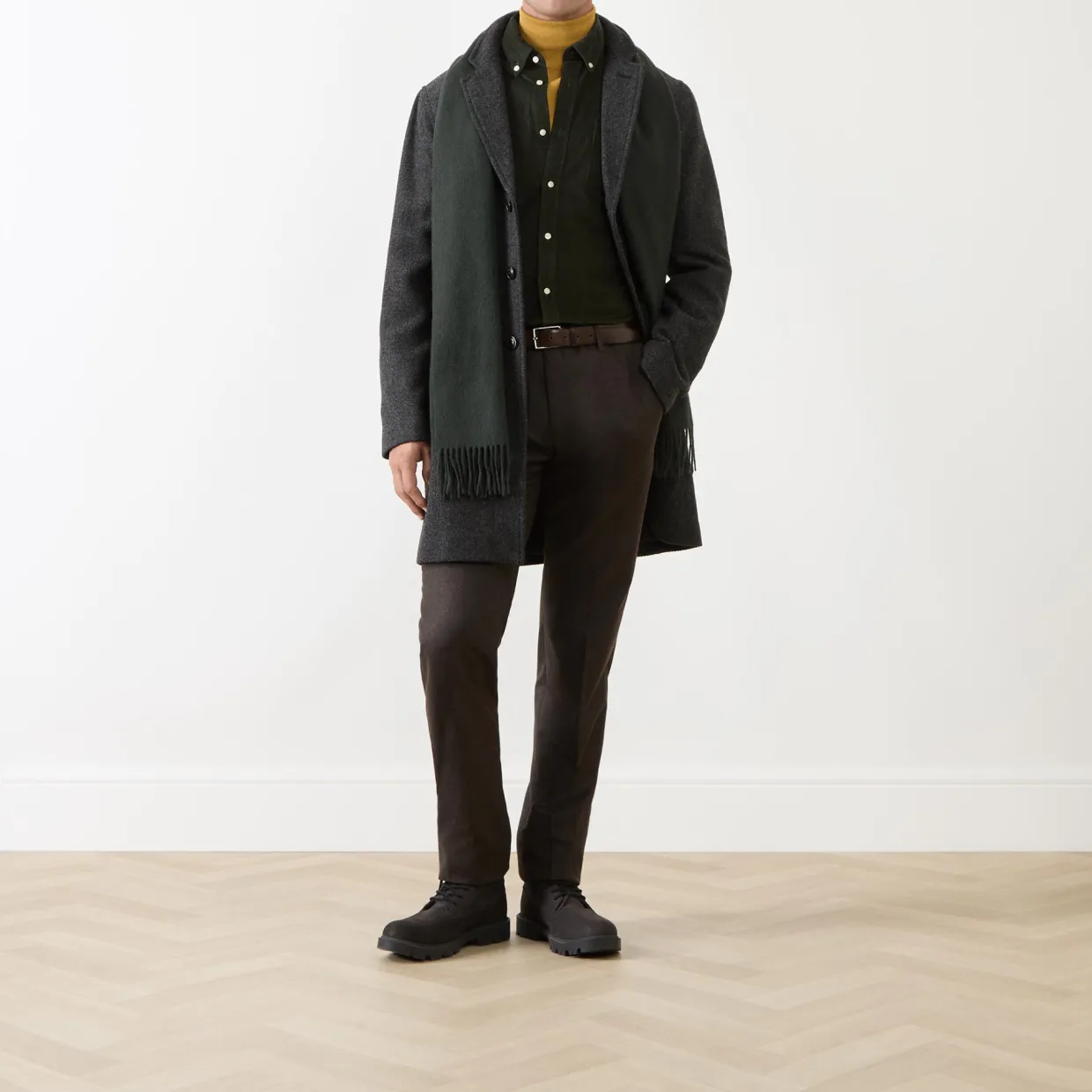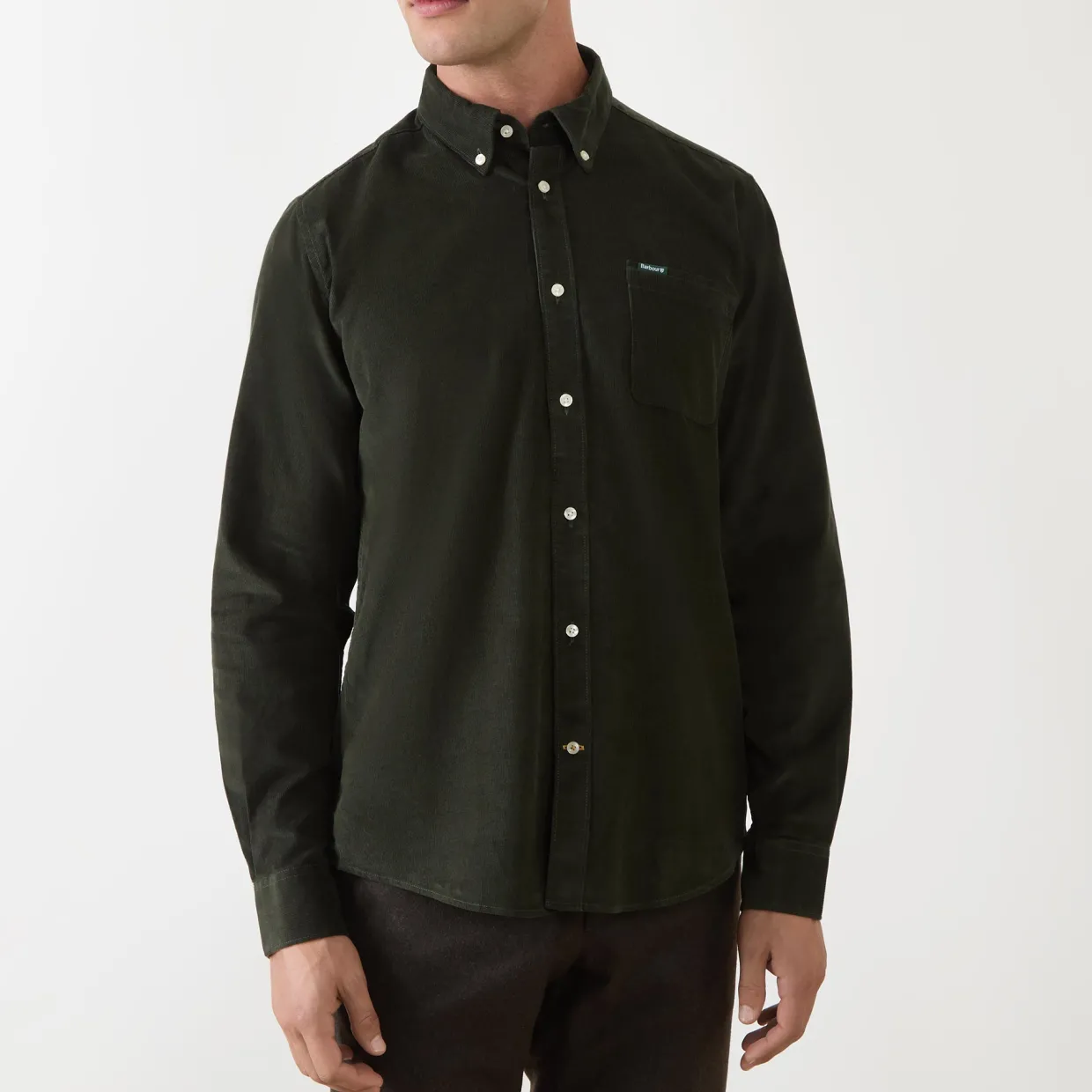 - Long sleeves, corduroy texture, button-down collar, curved hemline, logo detail, button fastenings, chest pocket