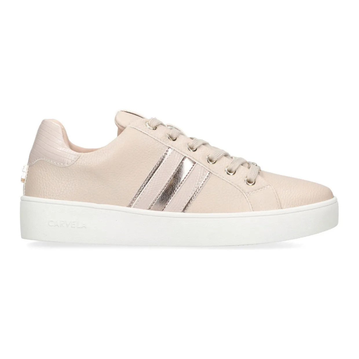 - Low top, lace-up style, rounded toe, gold-tone branding, metallic striped detail, Icon C stud