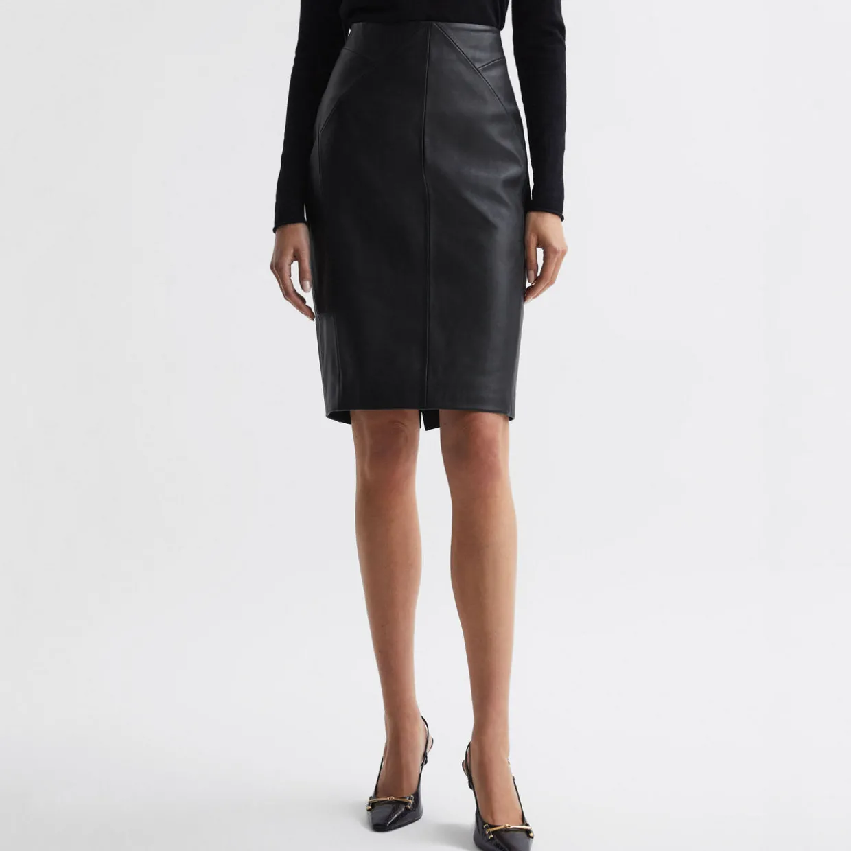 - High-rise, midi length, stretch panel to reverse, zip closure, hem vent, pencil shape