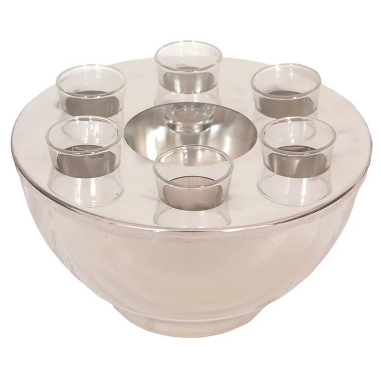 Elegant, polished stainless steel spirit cooler bowl, complete with 6 shot glasses.