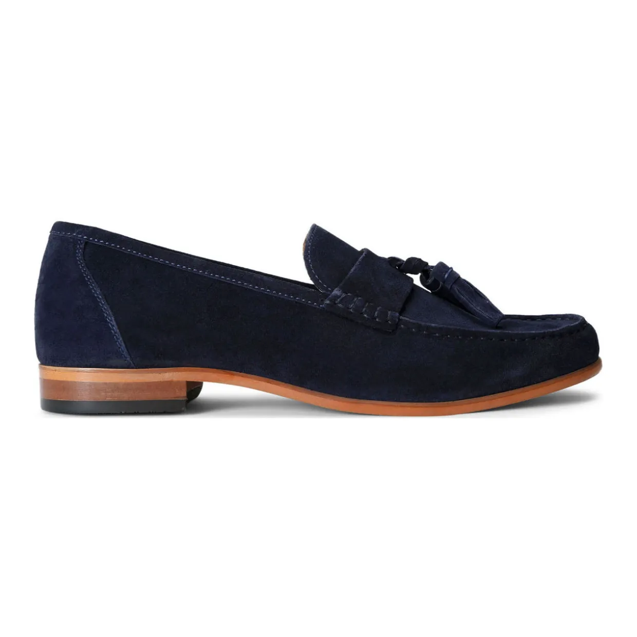 - Slip on, penny strap, tassel detail, suede finish, wood texture sole