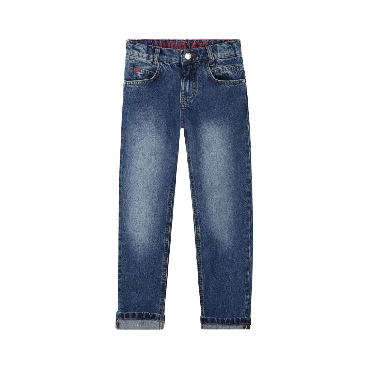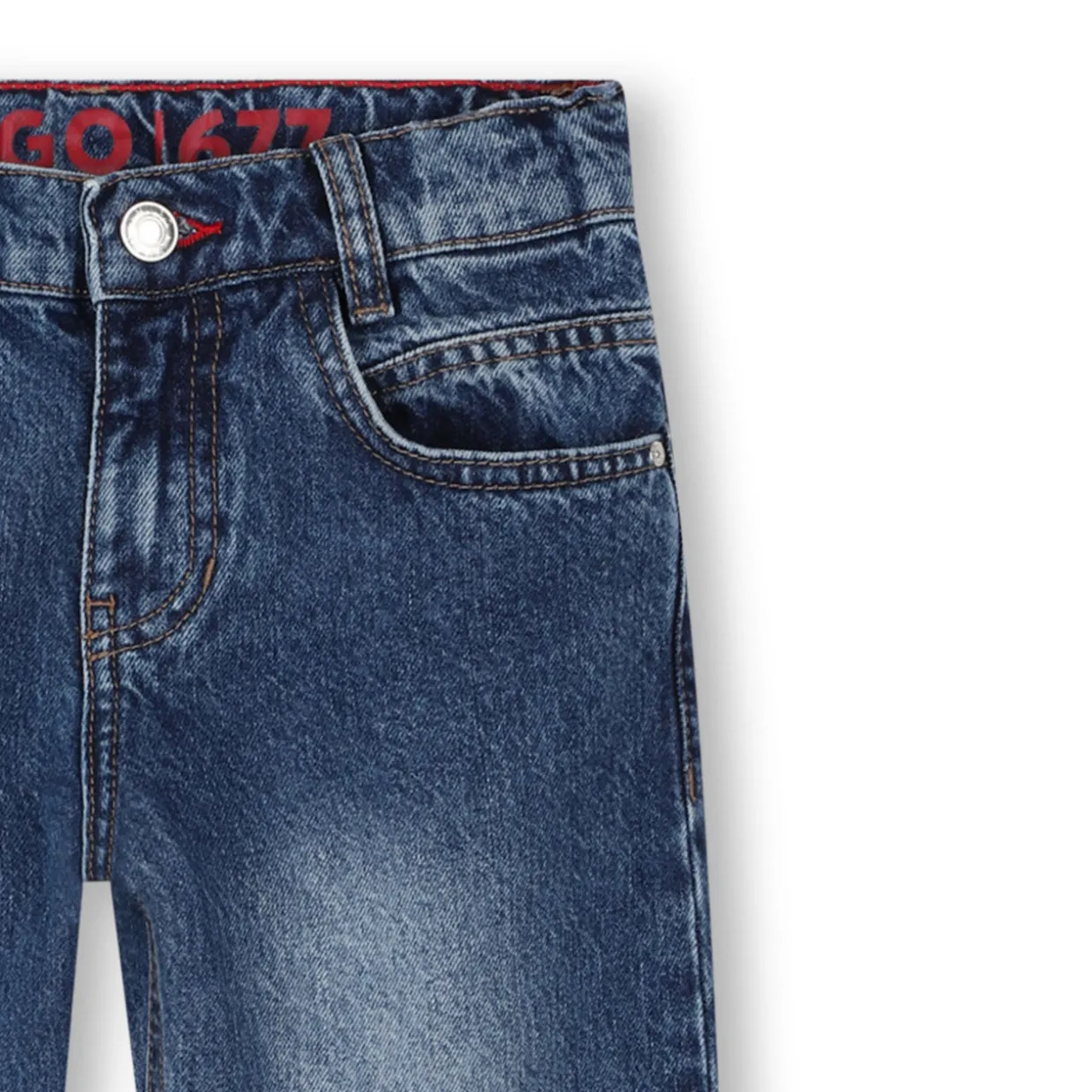 - Denim trousers, five-pocket style, rubber branded label on the back, branded metal rivets, mid wash, denim finish, faded detailing