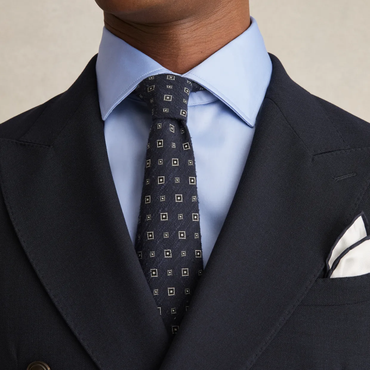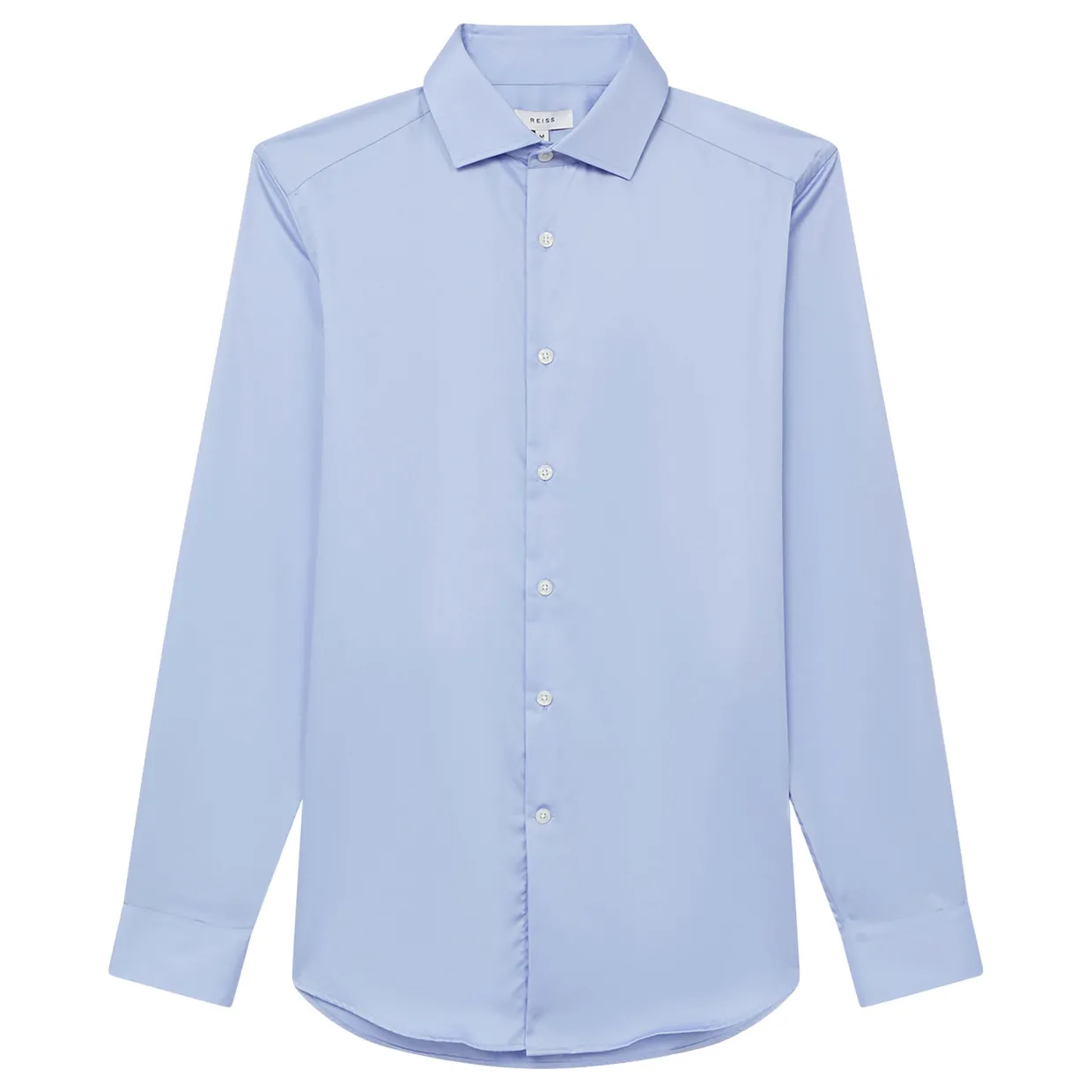 - Cotton satin fabric, subtle sheen, cutaway point collar, French button placket, long sleeves, buttoned cuffs