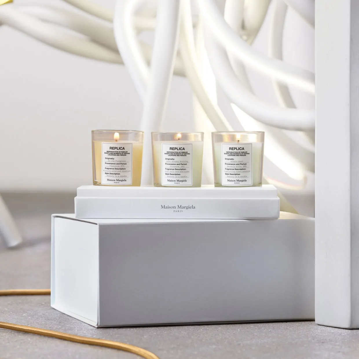 - Fill your rooms with the best Maison Margiela’s candles memories with our Candle Trio Set composed of our three bestsellers 70G minicandles : By the Fireplace, Lazy Sunday Morning, and Bubble Bath. This set is designed to transform the atmosphere of different rooms:By the Fireplace in the living room will provide you the pleasure of a reassuring fire crackling on a winter day, Lazy Sunday Morning in abedroom will make you smell the clean set of fresh laundry and Bubble Bath in a bathroom will offer you a moment of relaxation and self-indulgence.