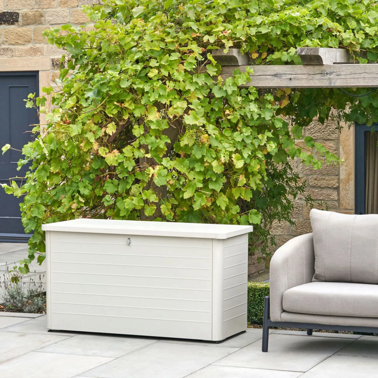 Easily store outdoor cushions and blankets with this contemporary storage box. The box features a slim, close-lat design with gas pump hinges and adjustable feet for ease of movement. This is the perfect finishing touch for any garden.