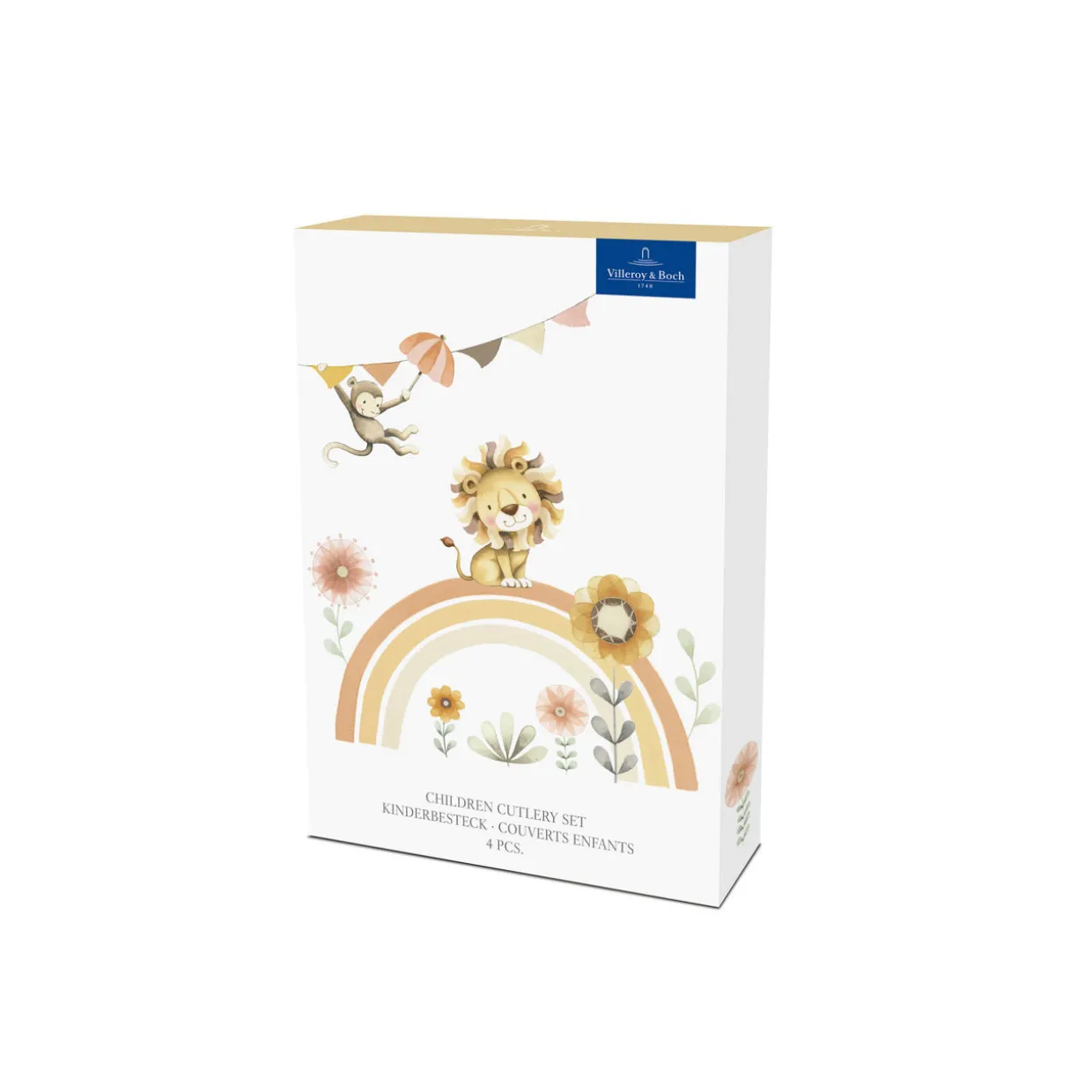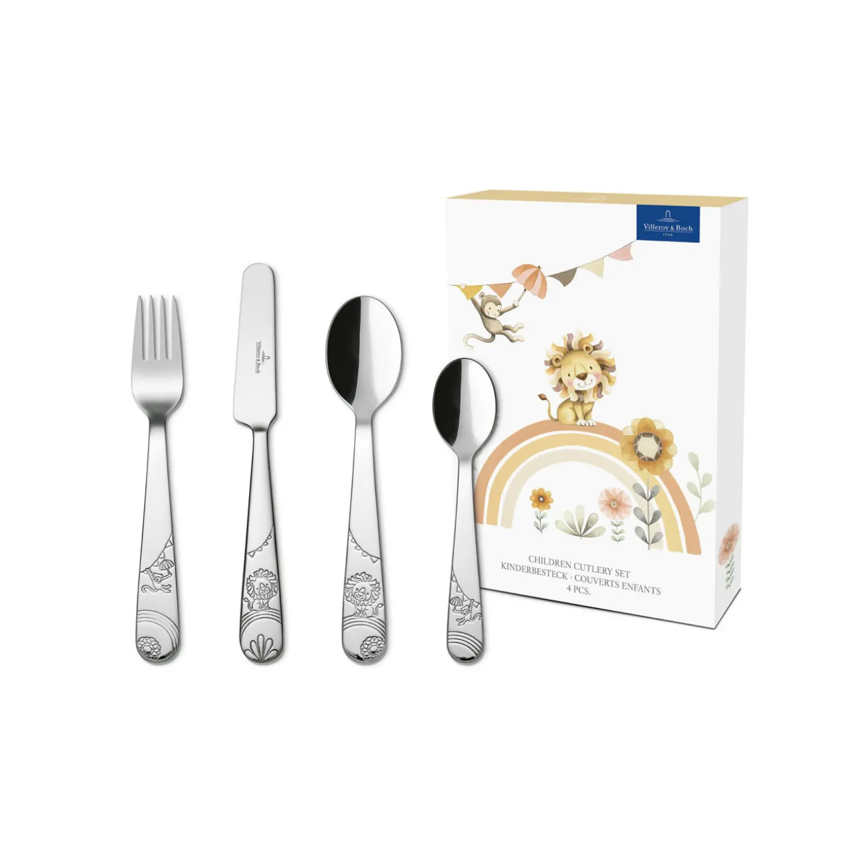 - 4-piece set, includes one fork, one knife, one spoon, one teaspoon, child-friendly designs, stainless steel finish, monkey and lion engraved details