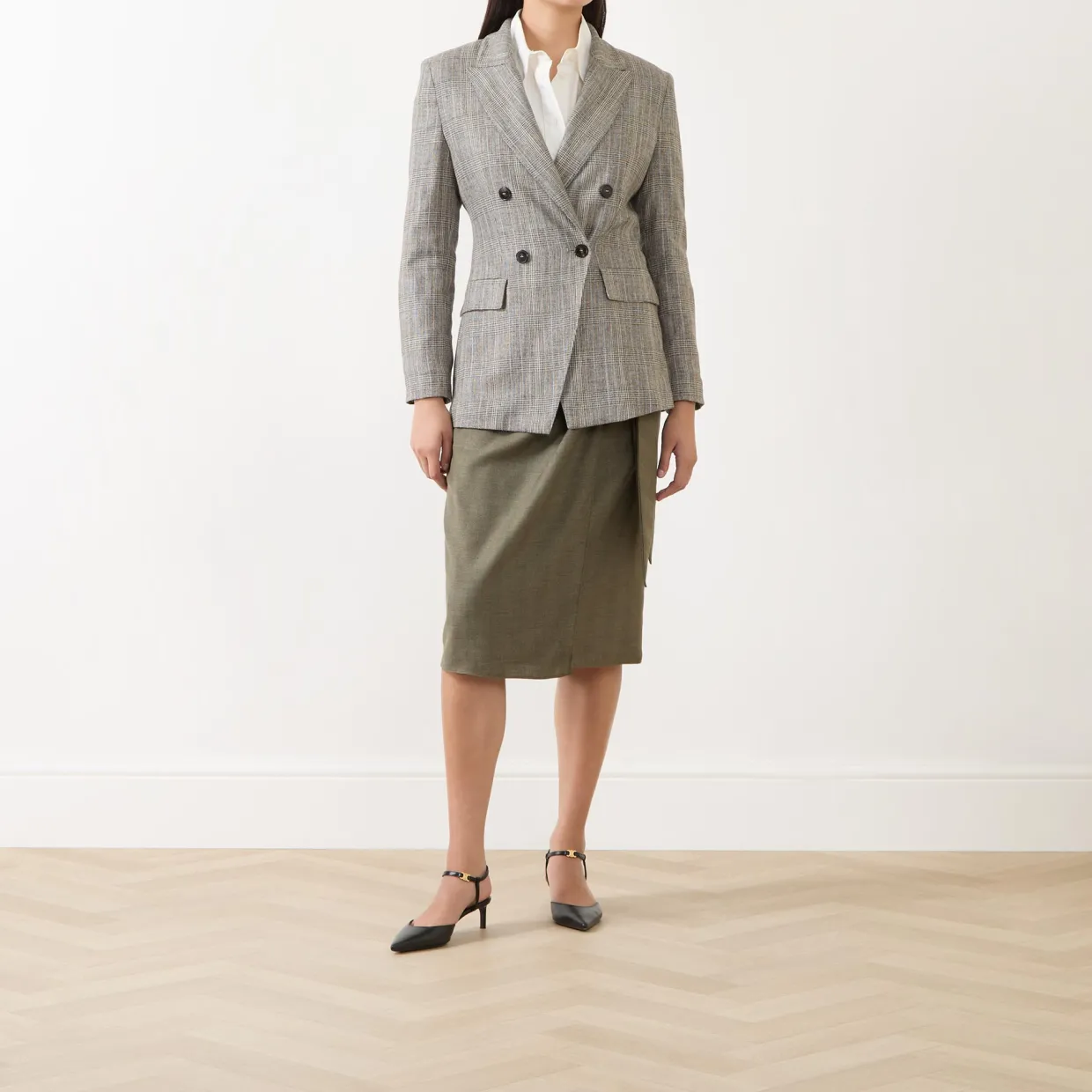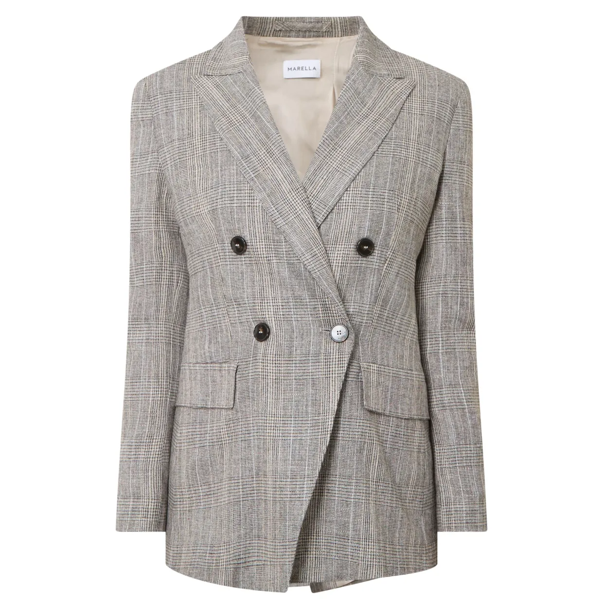 - Double-breasted, peaked lapels, button fastening, vent at rear, flap pockets, Prince of Wales pattern