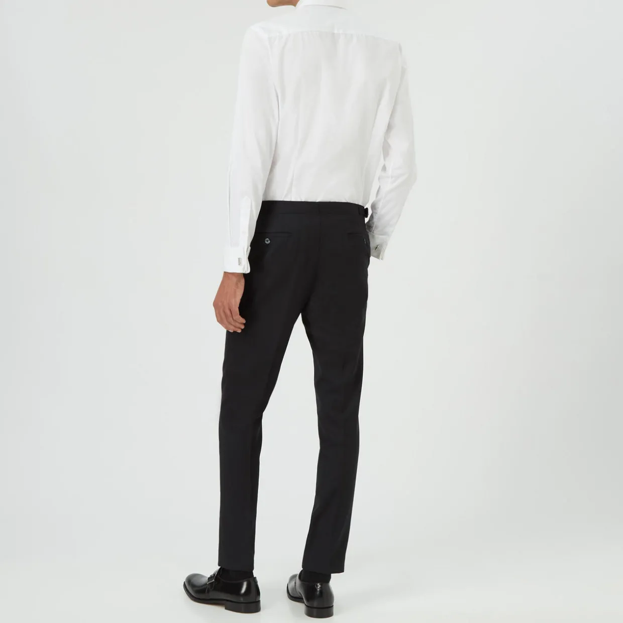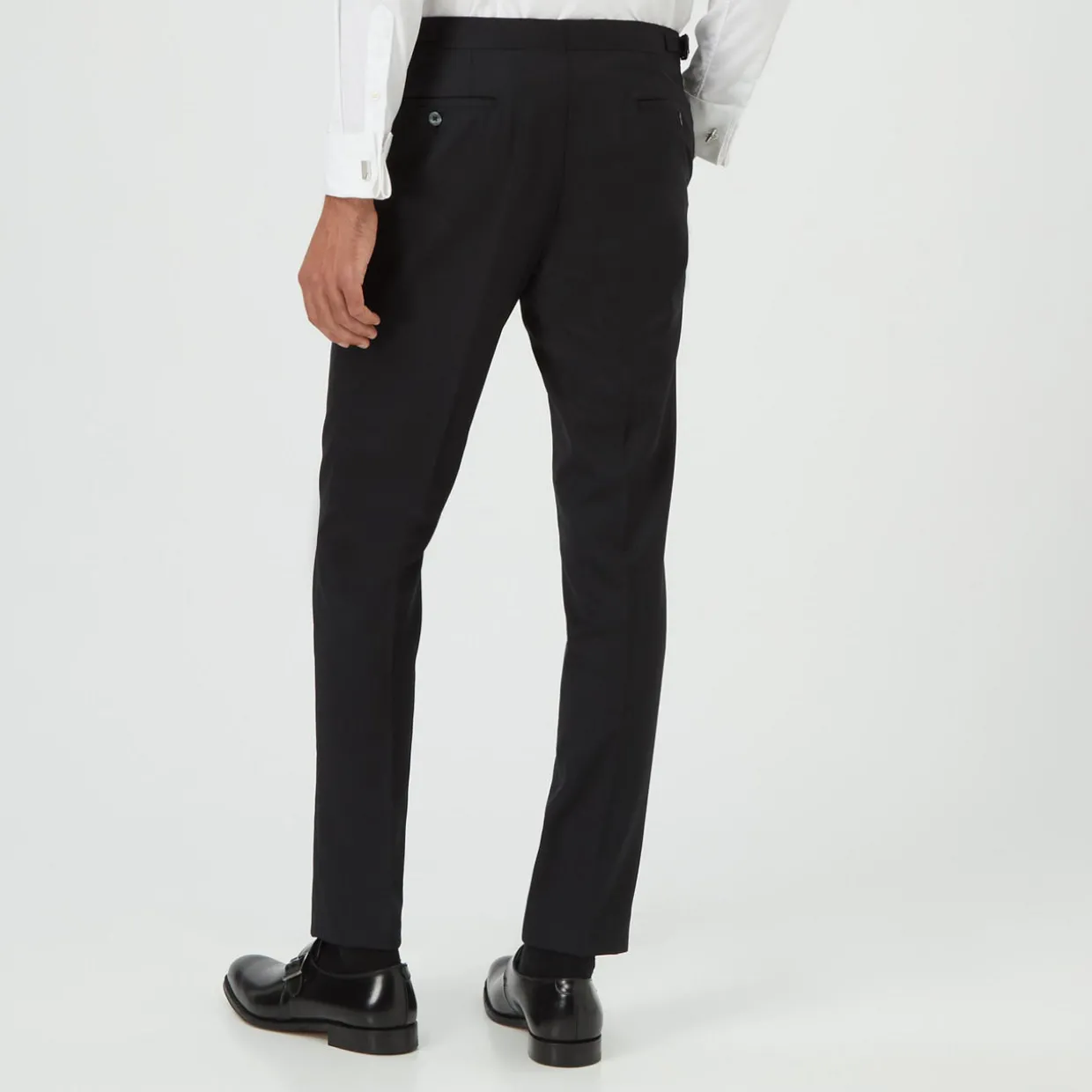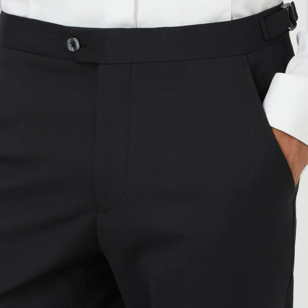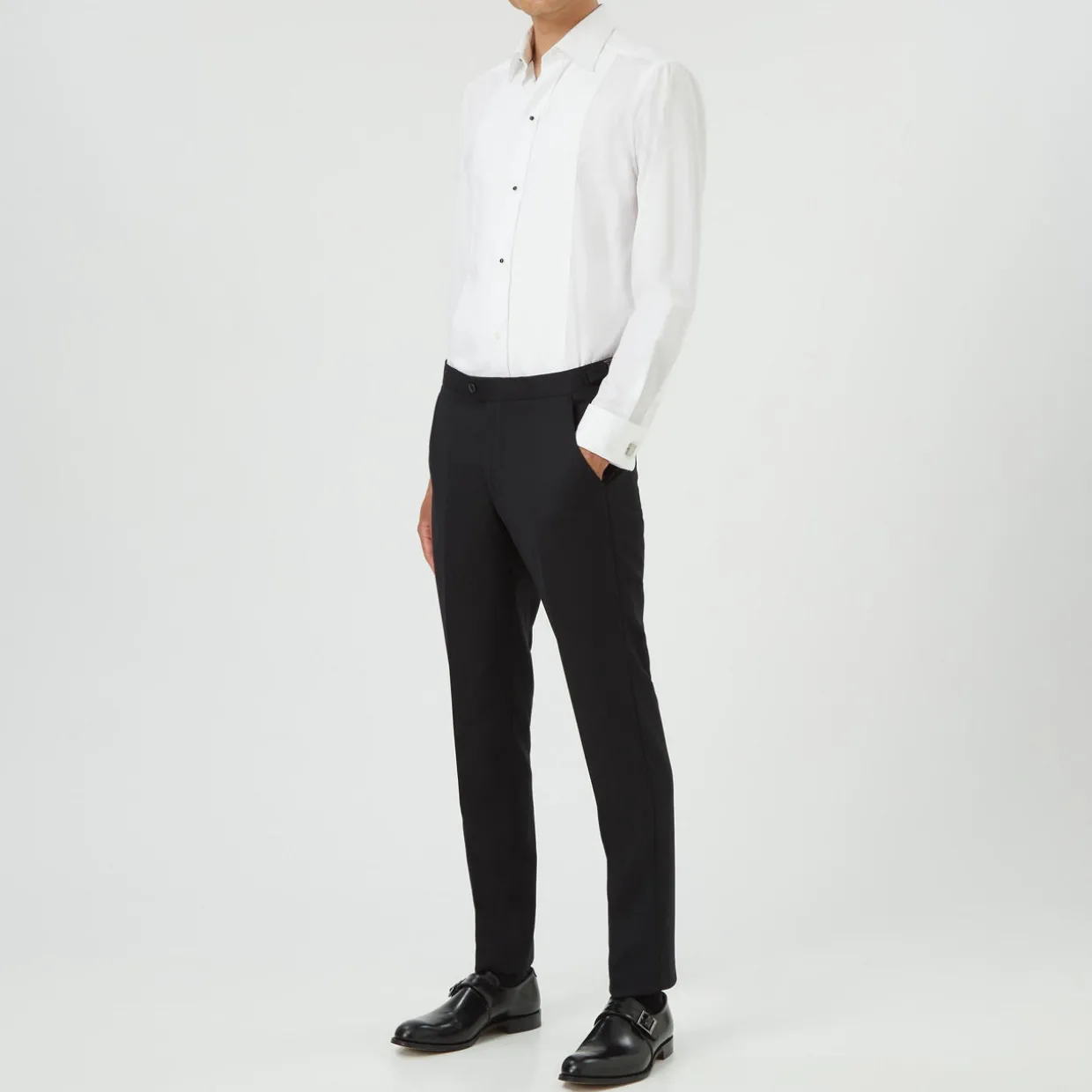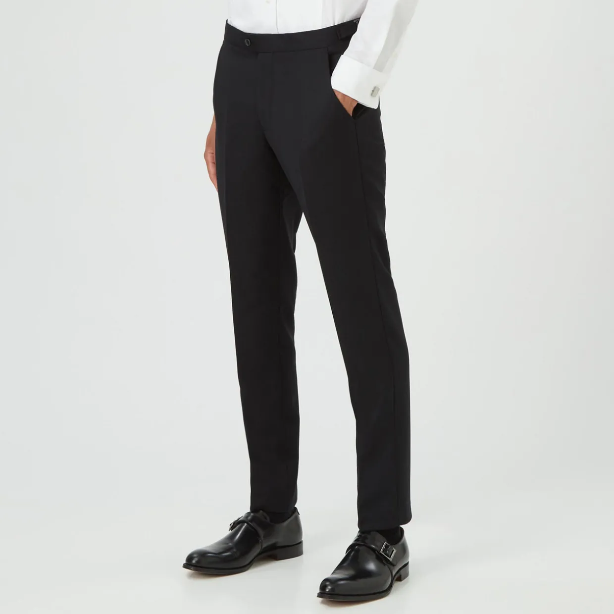 - Slim fit, pressed creases, side pockets, belt loops, button fastening, zip fastening.