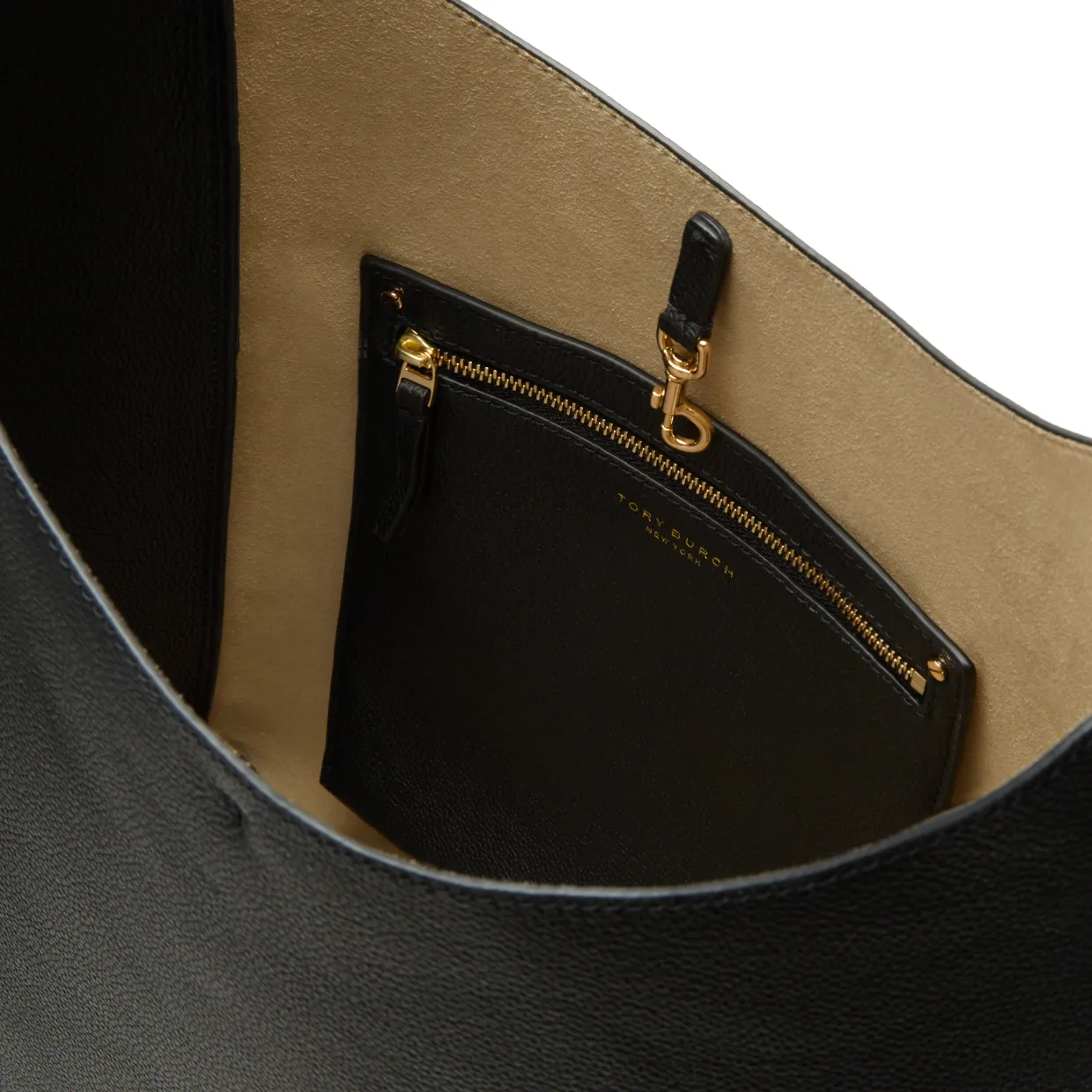 - Adjustable shoulder strap, open-top design, gold-tone hardware, pebbled leather finish, tonal stitching, structured silhouette