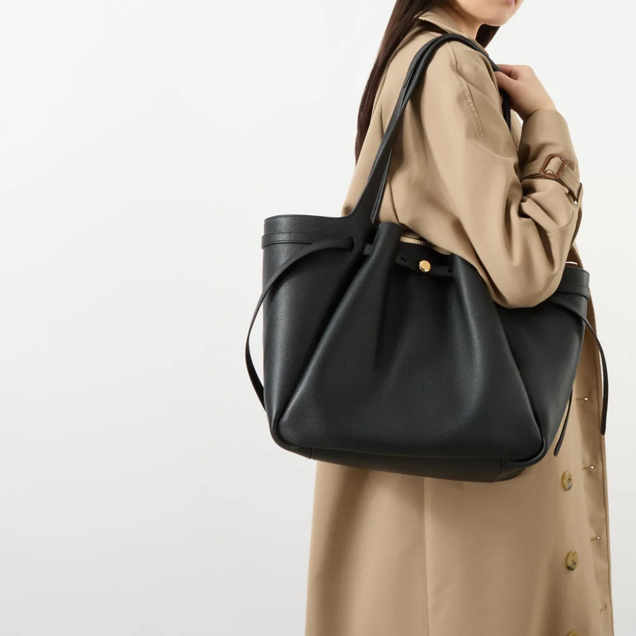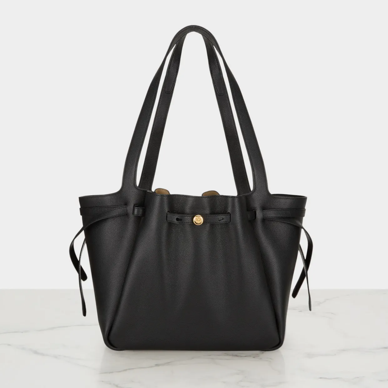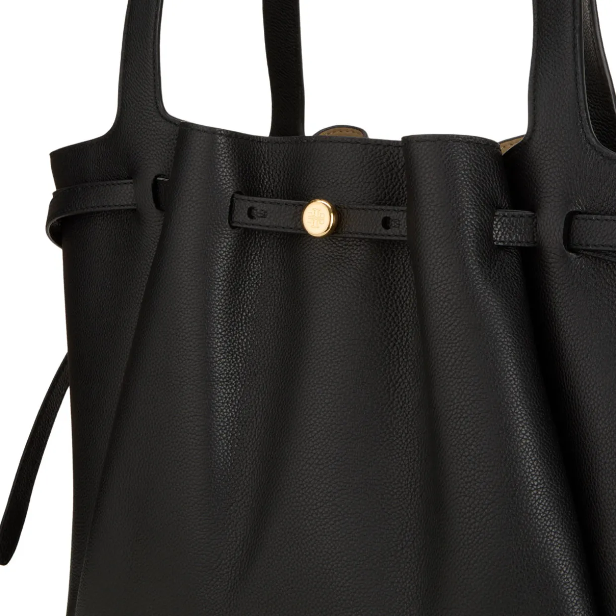 - Pebbled leather, magnetic snap closure, belted strap with stud closure, double top handles, gold-tone logo hardware, dust bag