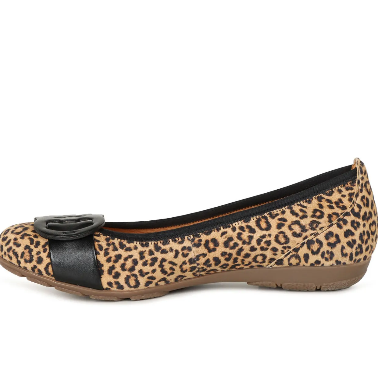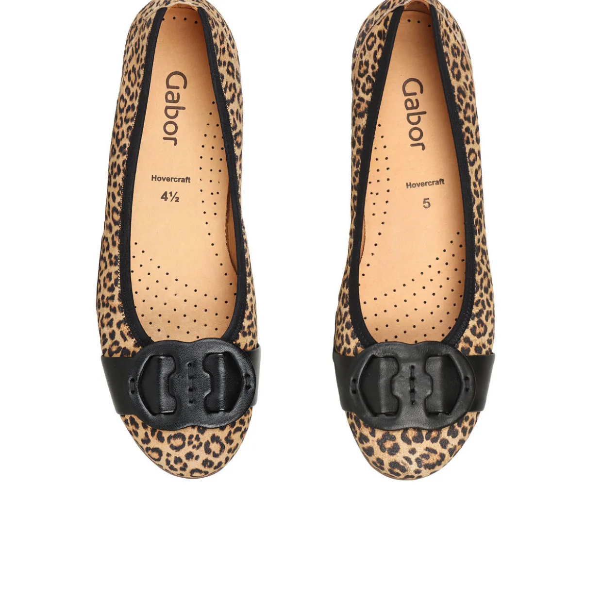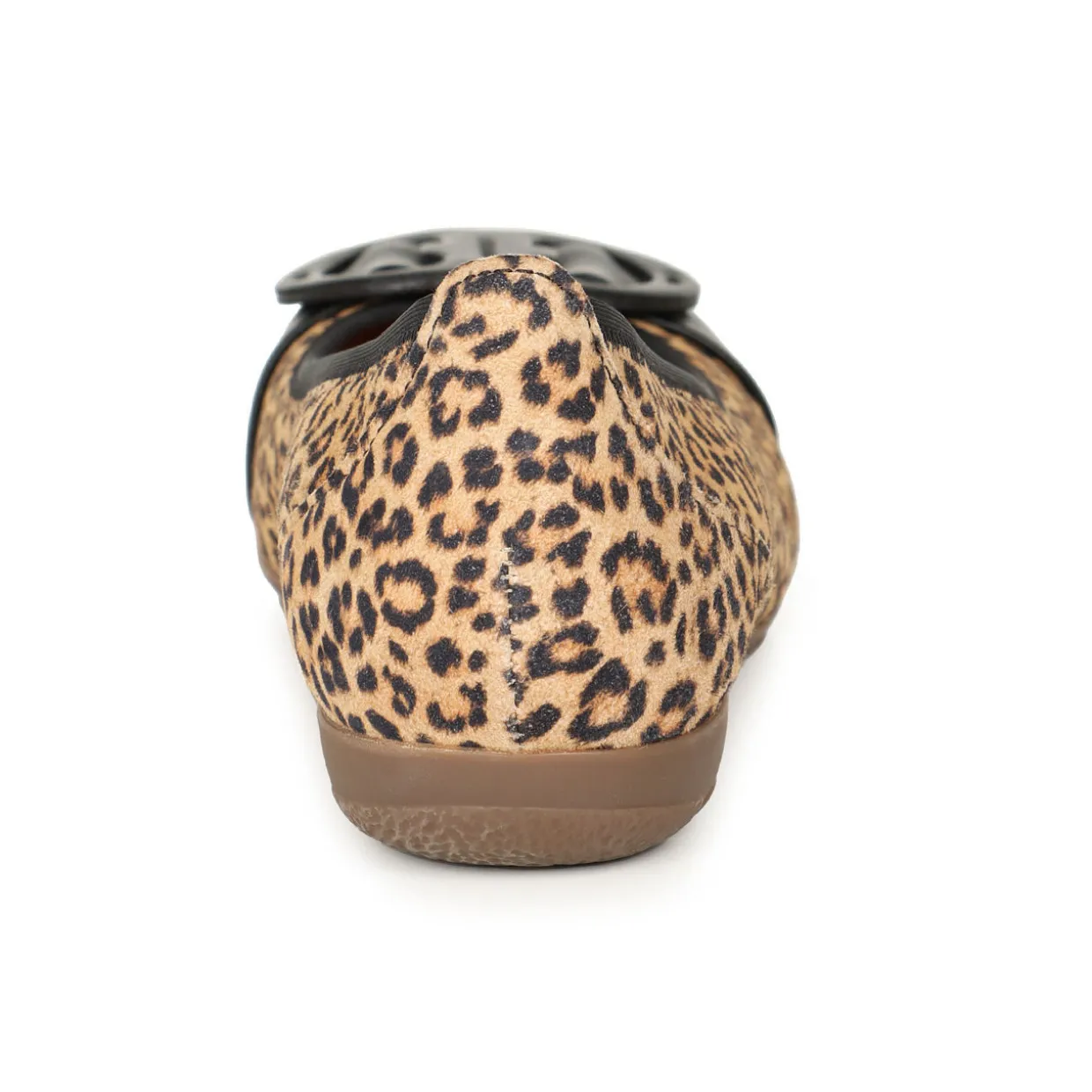- Round toe, oversized buckle effect detail, tonal hardware, textured sole, slip on silhouette, leopard print finish