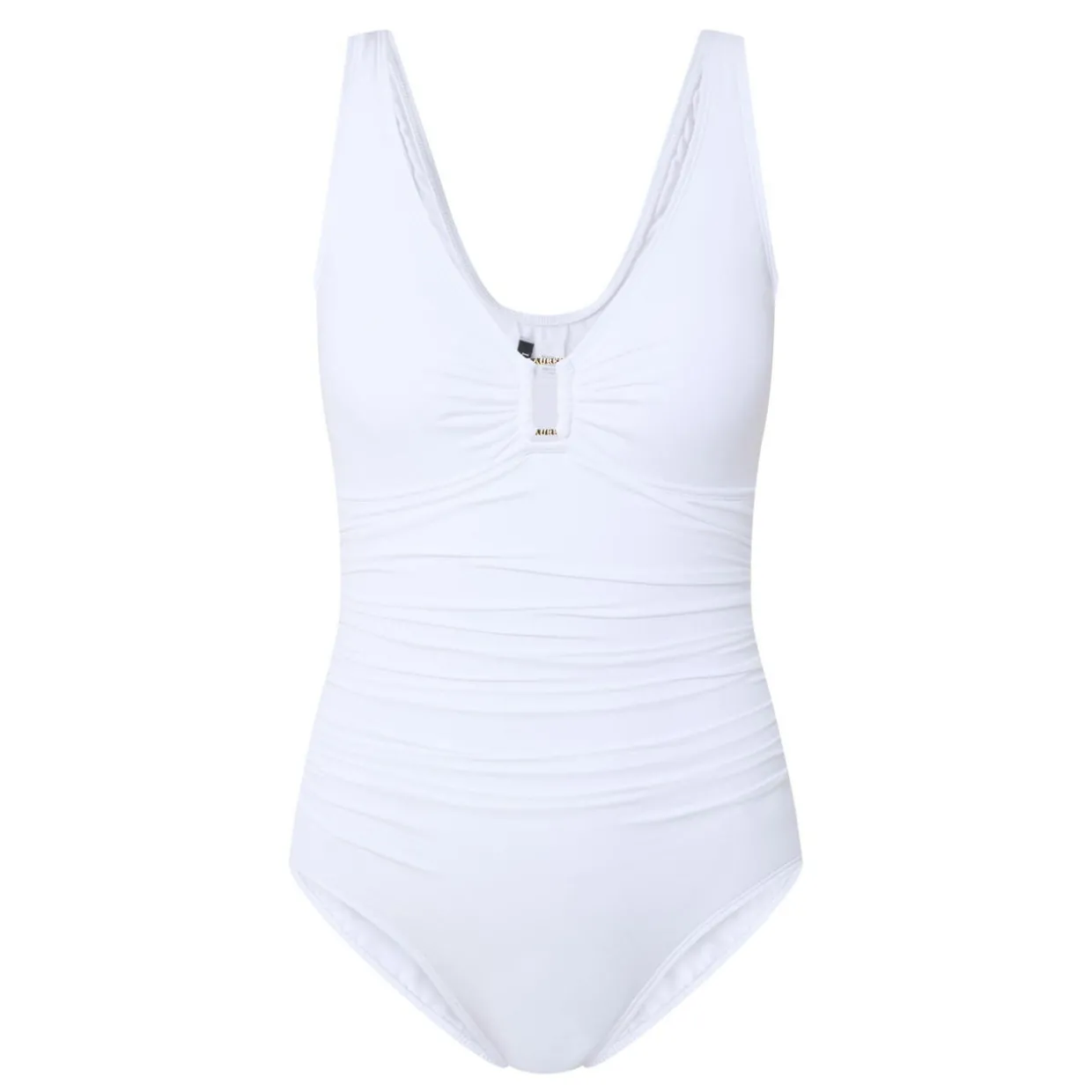 - Plunge neckline, scoop back, ring hardware detail, ruched structure, high-cut legs, medium coverage, logo plate at back