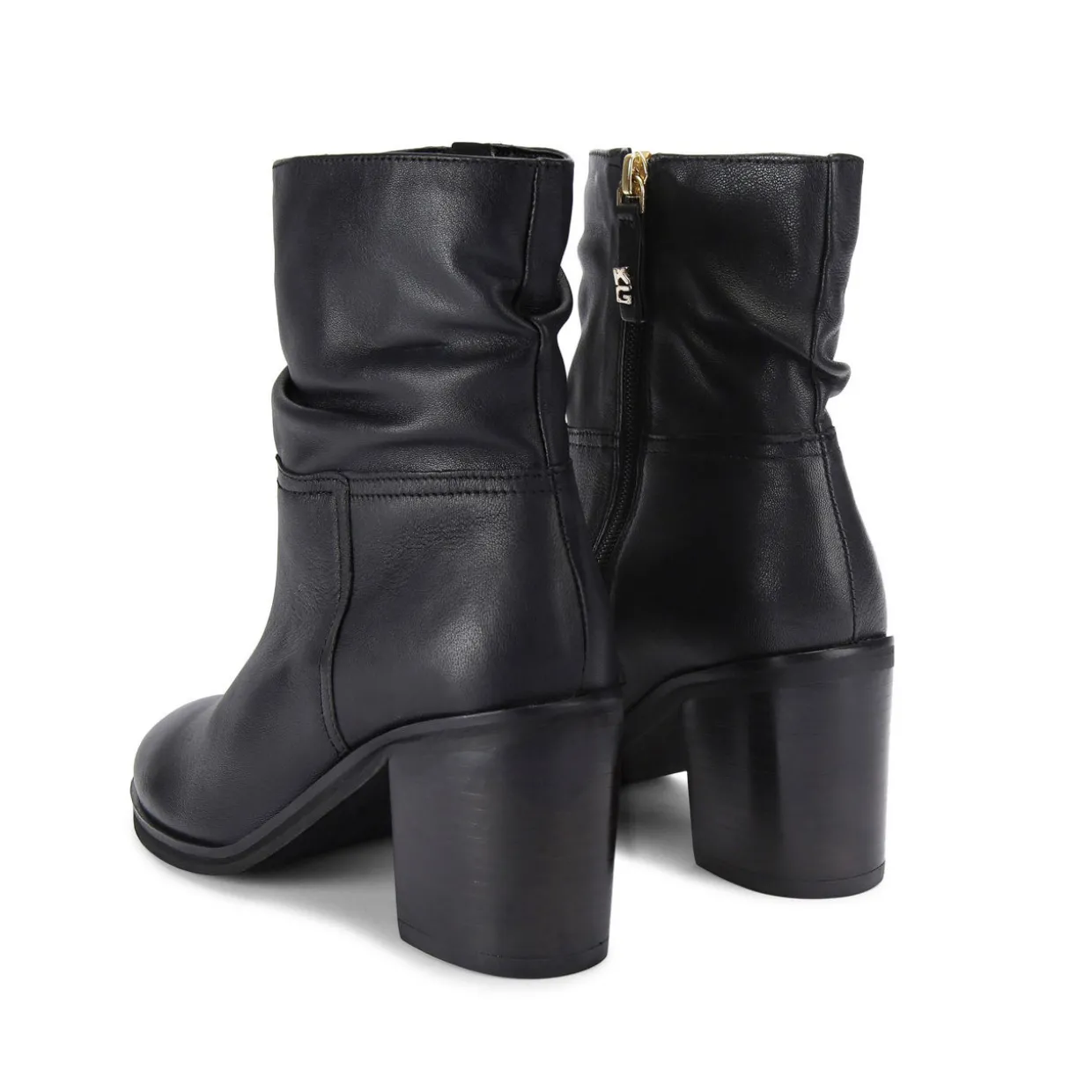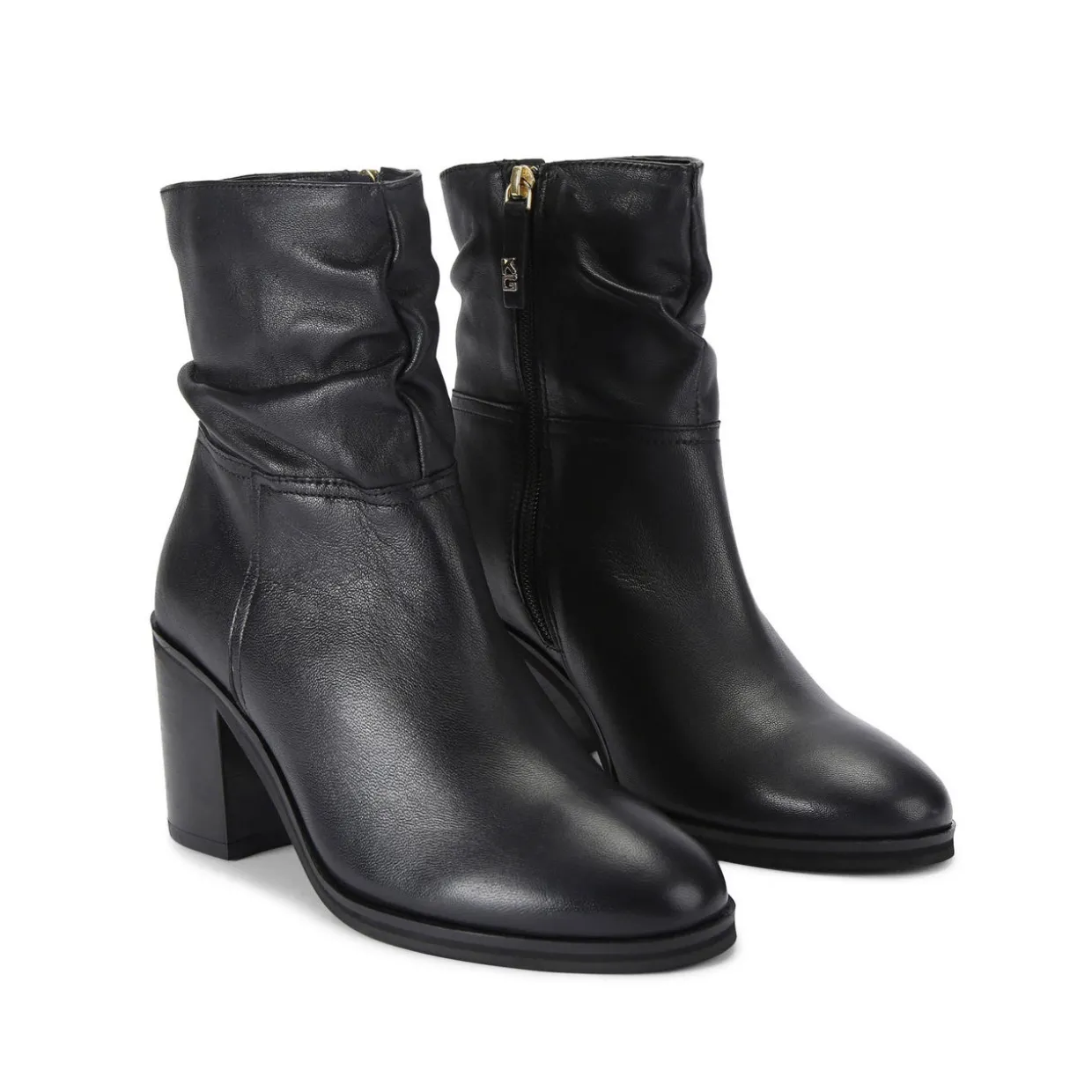 - Block heel, ruched detailing, round toe, side zip fastening, gold-tone hardware