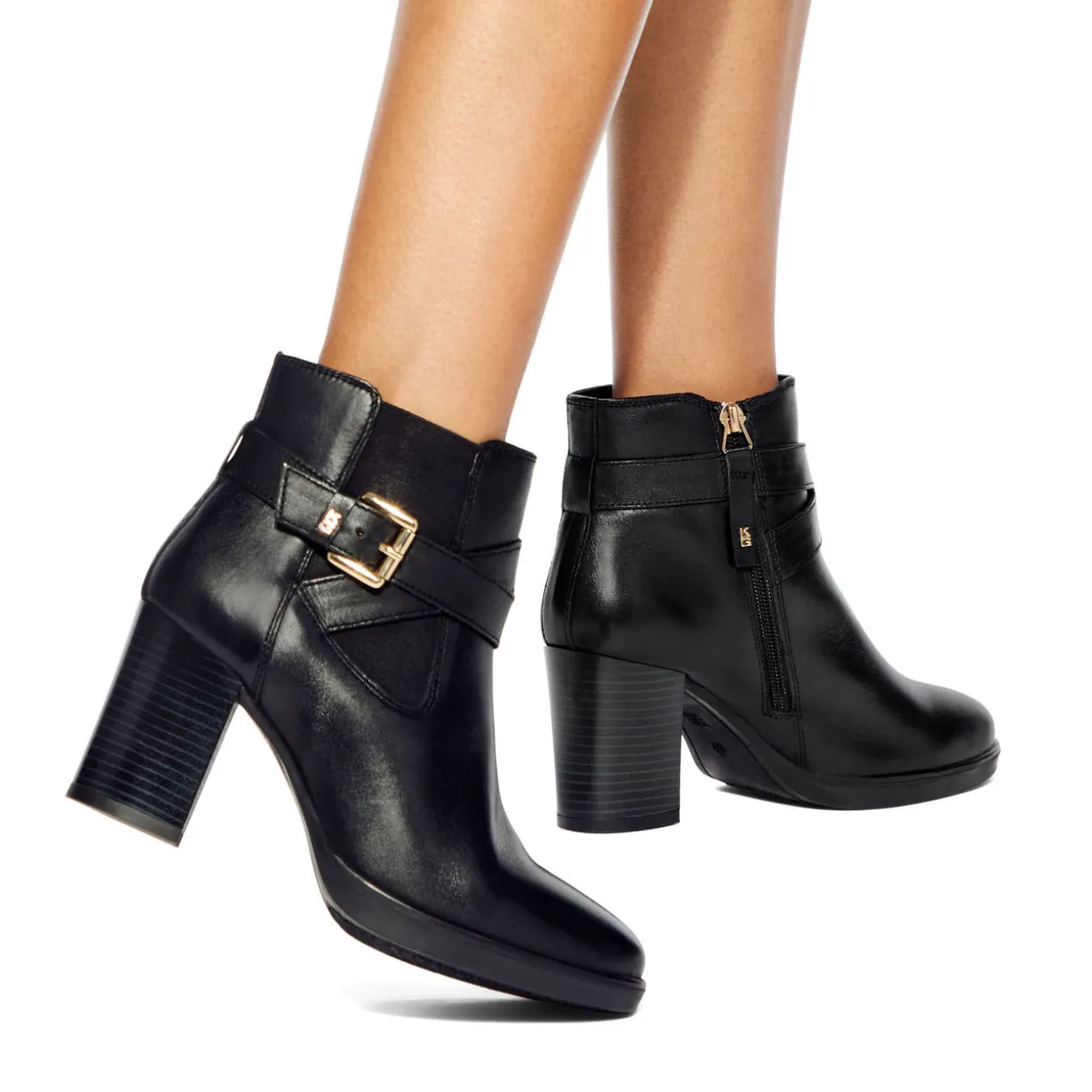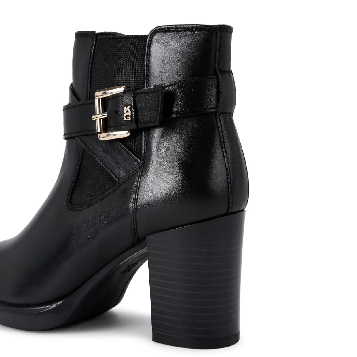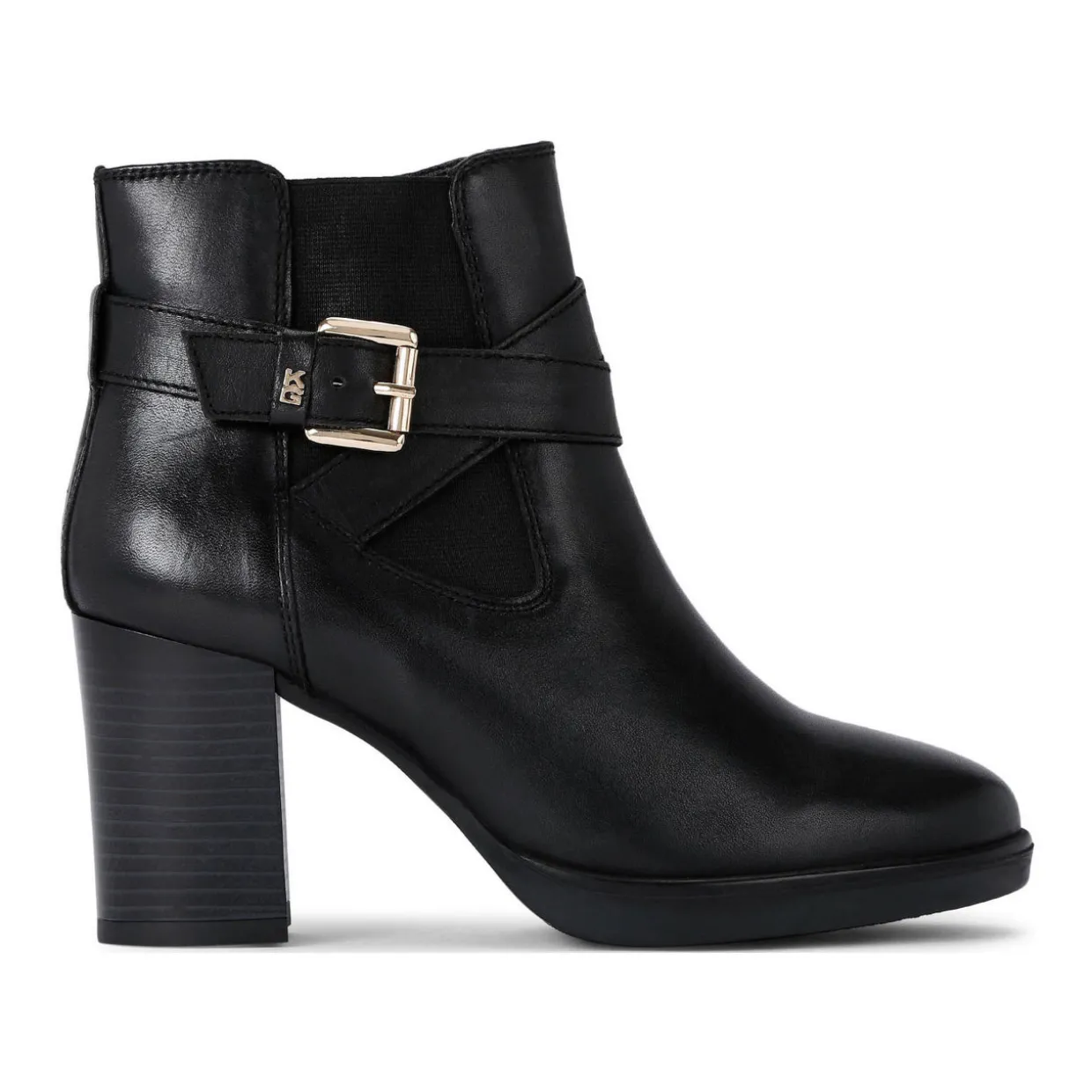 - Almond-shaped toe, elasticated side panel, ankle strap with buckle, block heel
