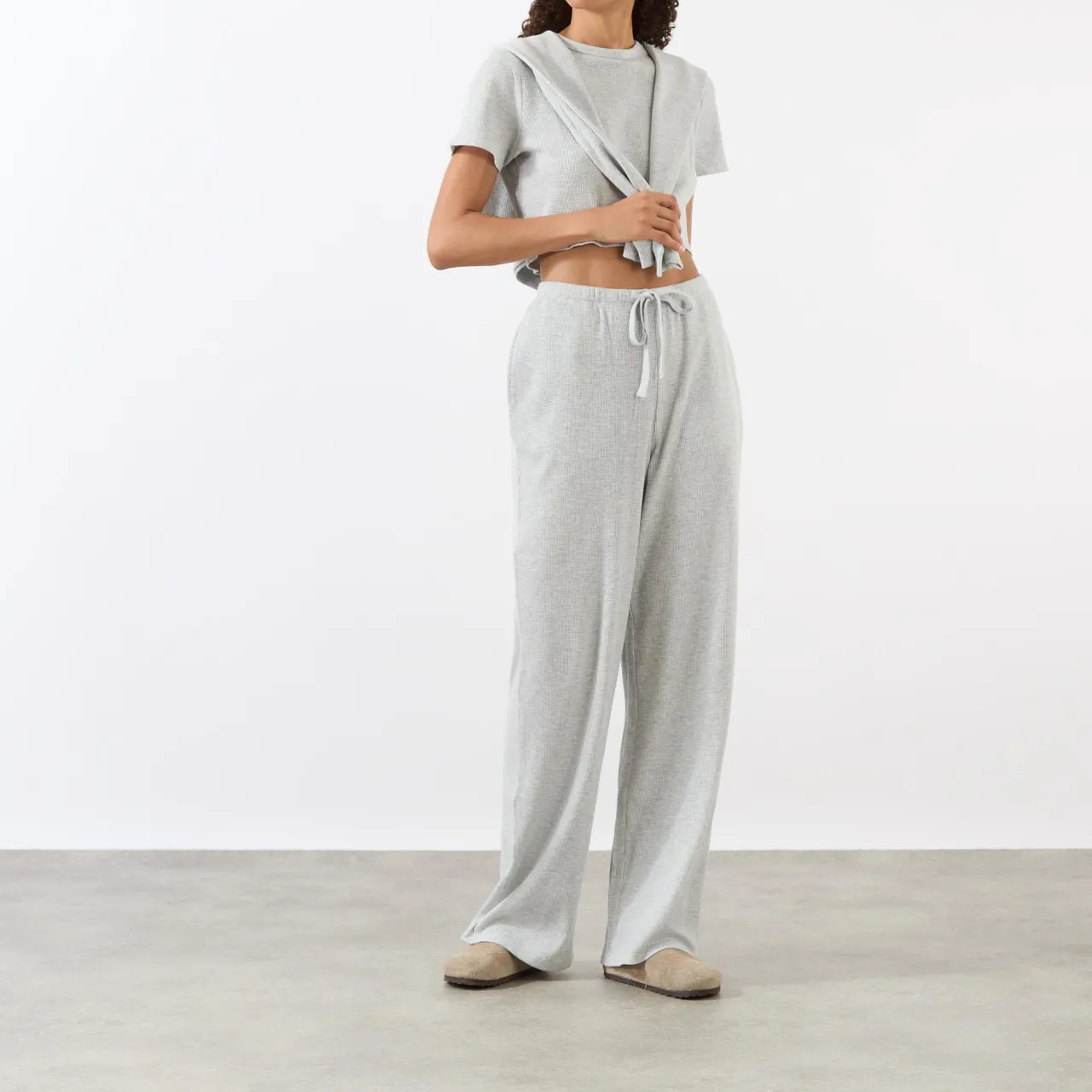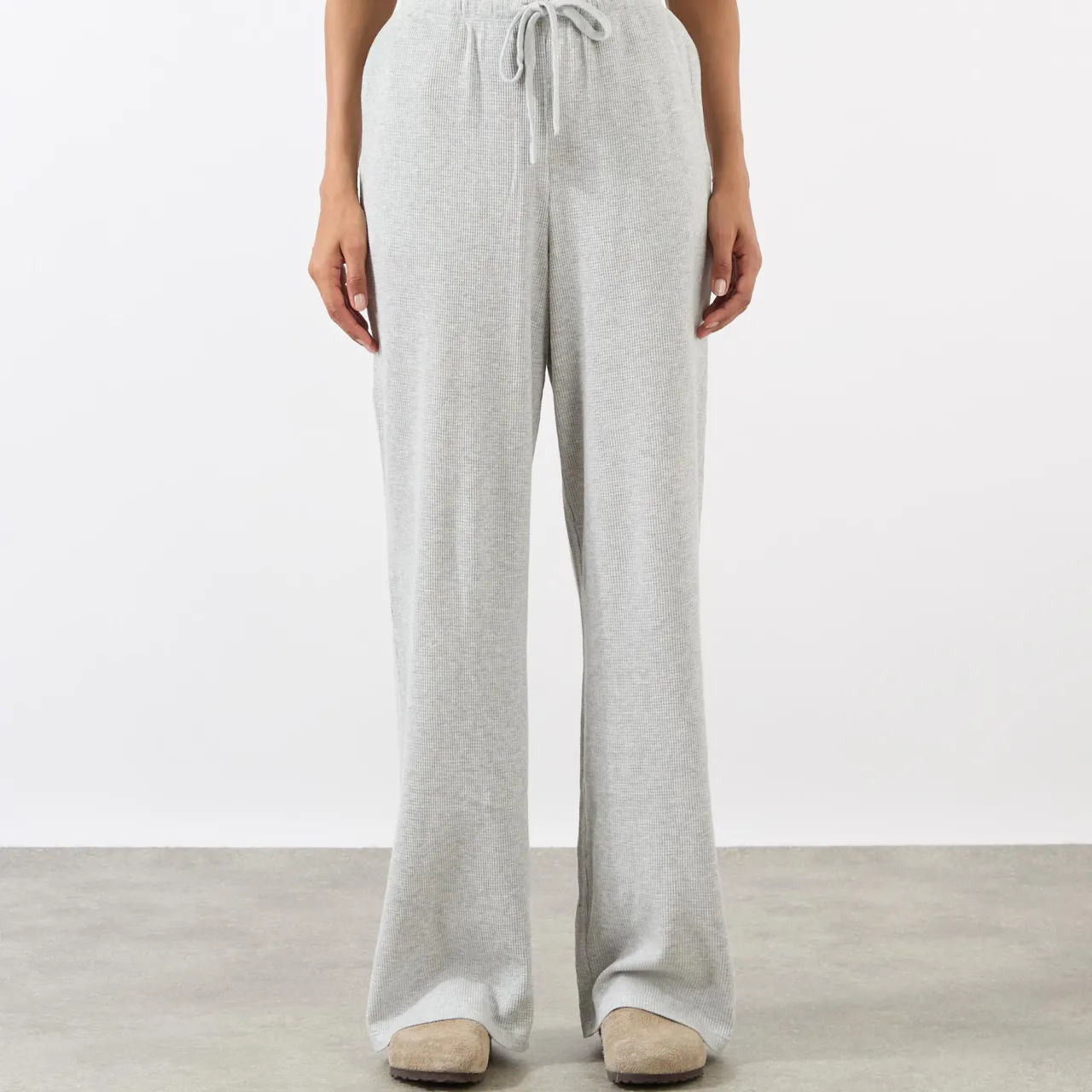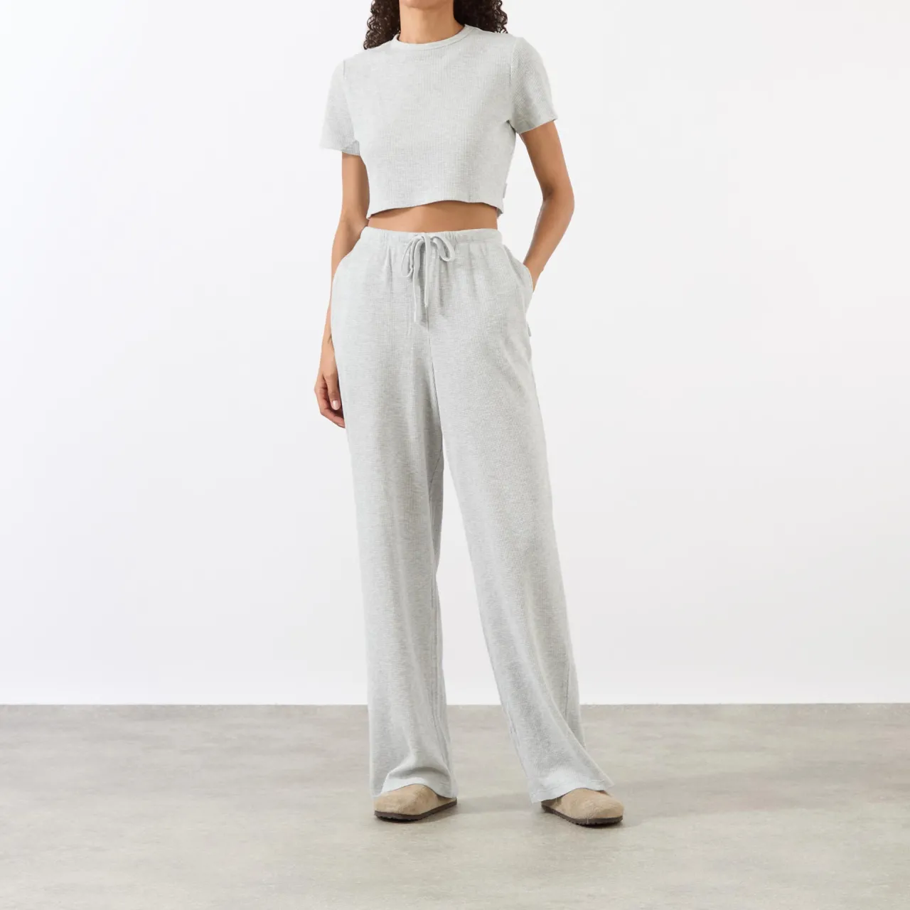 - Drawcord waistband, branded woven tab at side seam, two side in-seam pocket, straight-cut leg, waffle finish