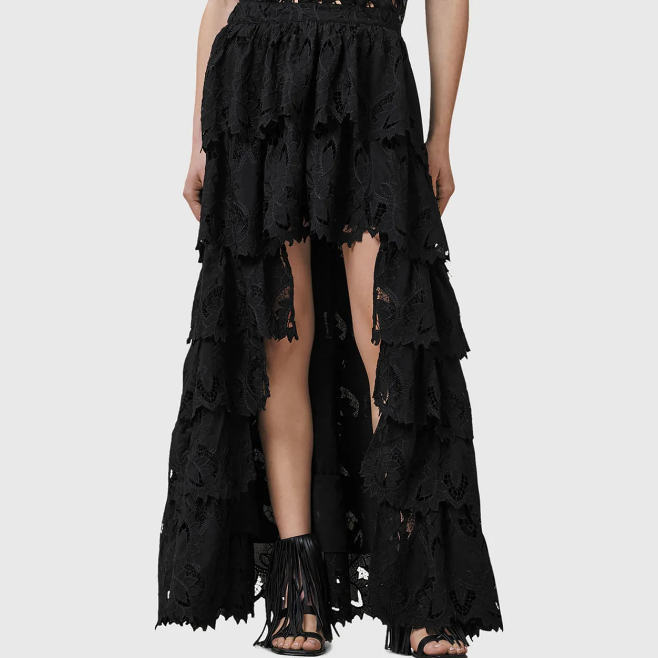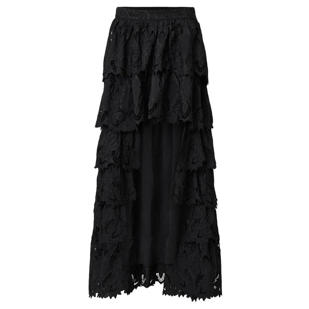 - Ruffled tiers, high-low hemline shaping, all-over broderie fabric, zip closure