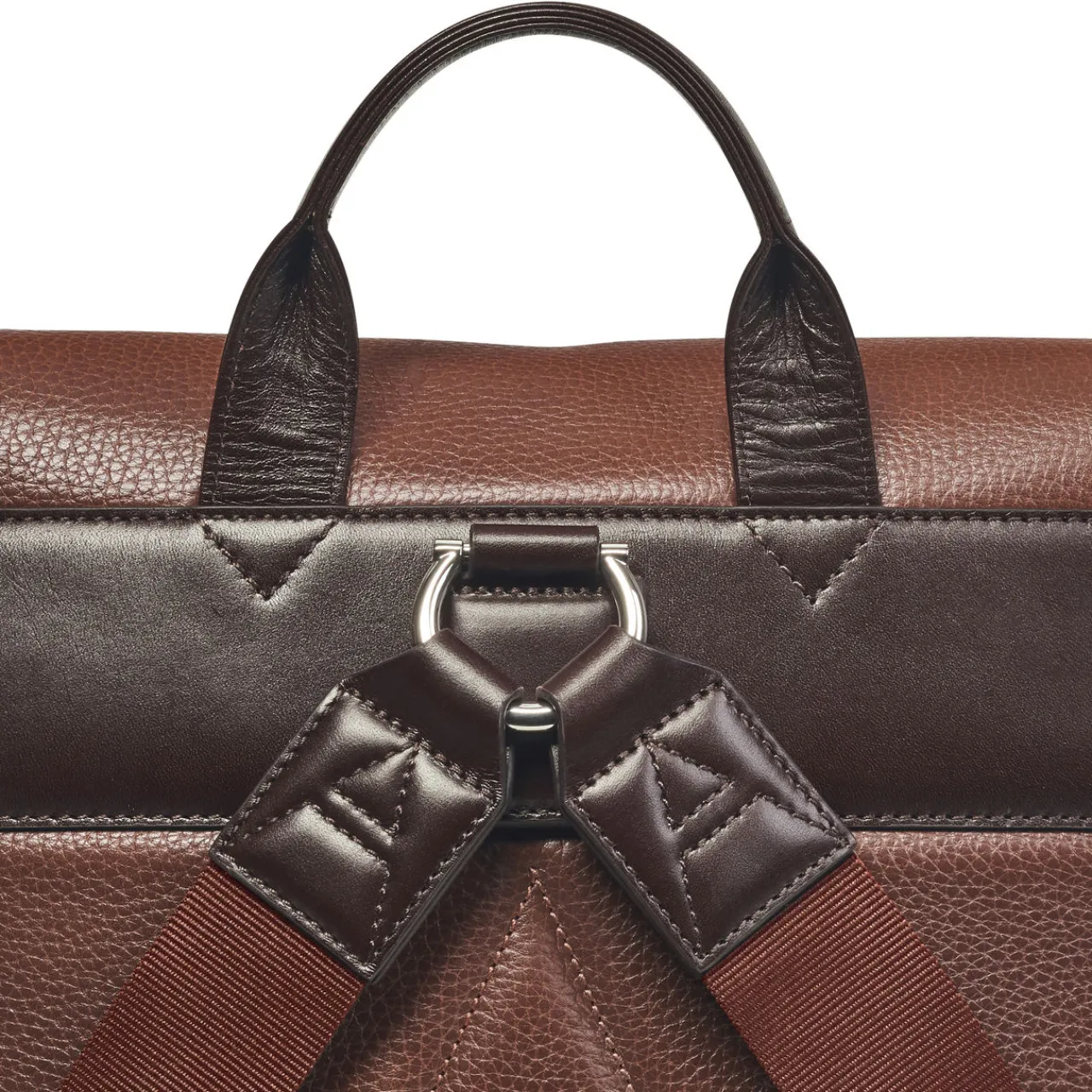 - Flap closure with adjustable drawstring closure and snap button fastening, adjustable webbing straps, two exterior pockets with zip fastenings, silver-tone hardware, logo lettering, grained leather texture