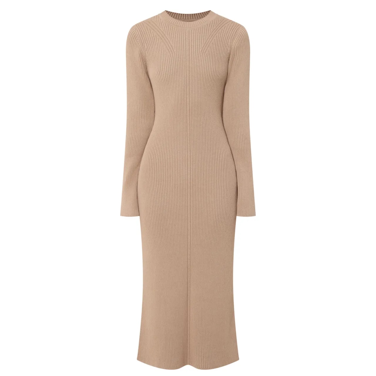 - Round neckline, long sleeves, midi length, rib knit structure, vent at back, logo detail