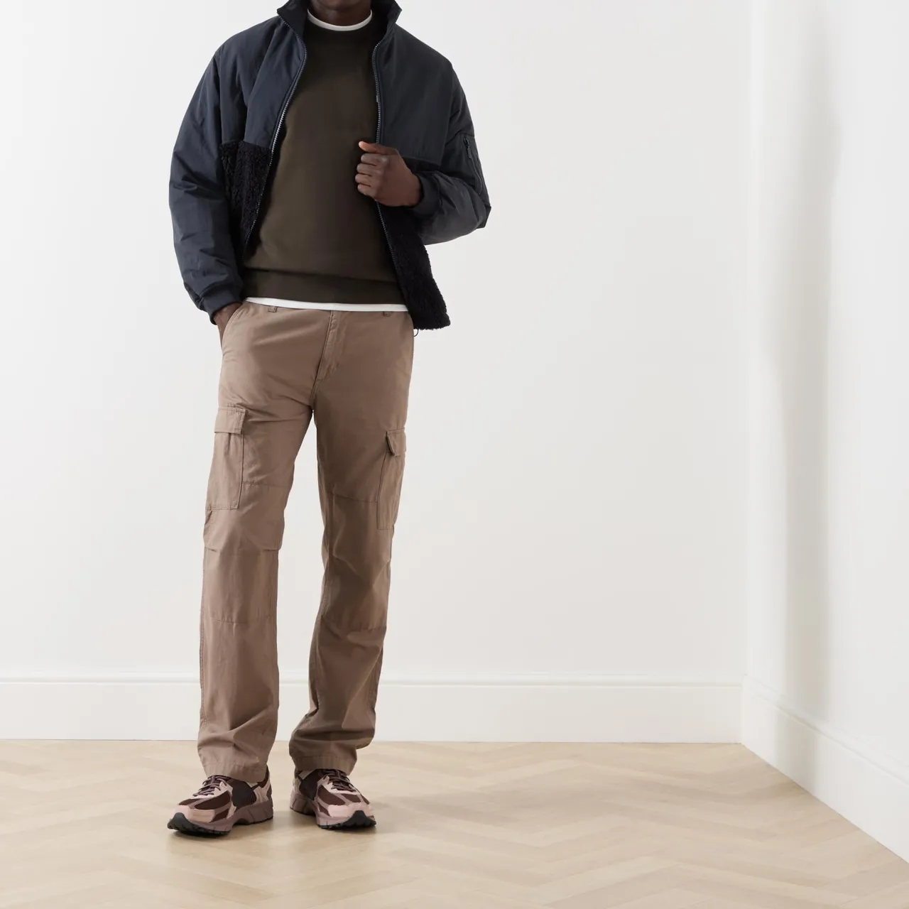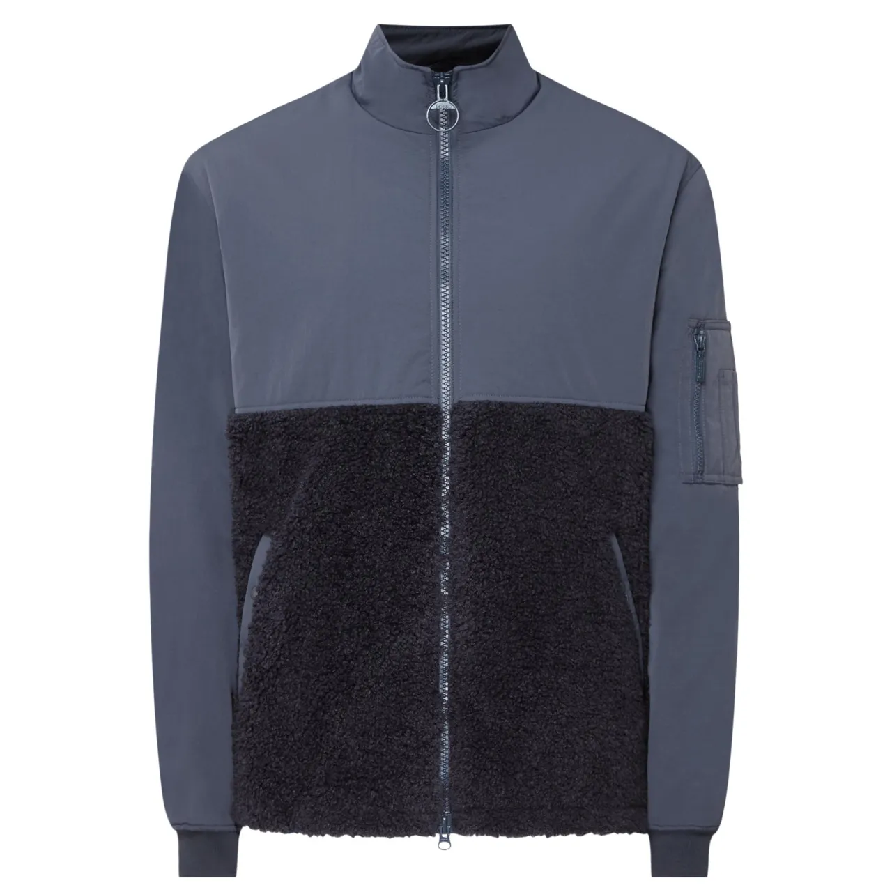 - Stand collar, long sleeves, elasticated cuffs, two-way front zip fastening, two angled pockets with snap button fastenings, one zip pocket on the arm, straight hem, contrasting fabric, fleece finish, embroidered logo detail
