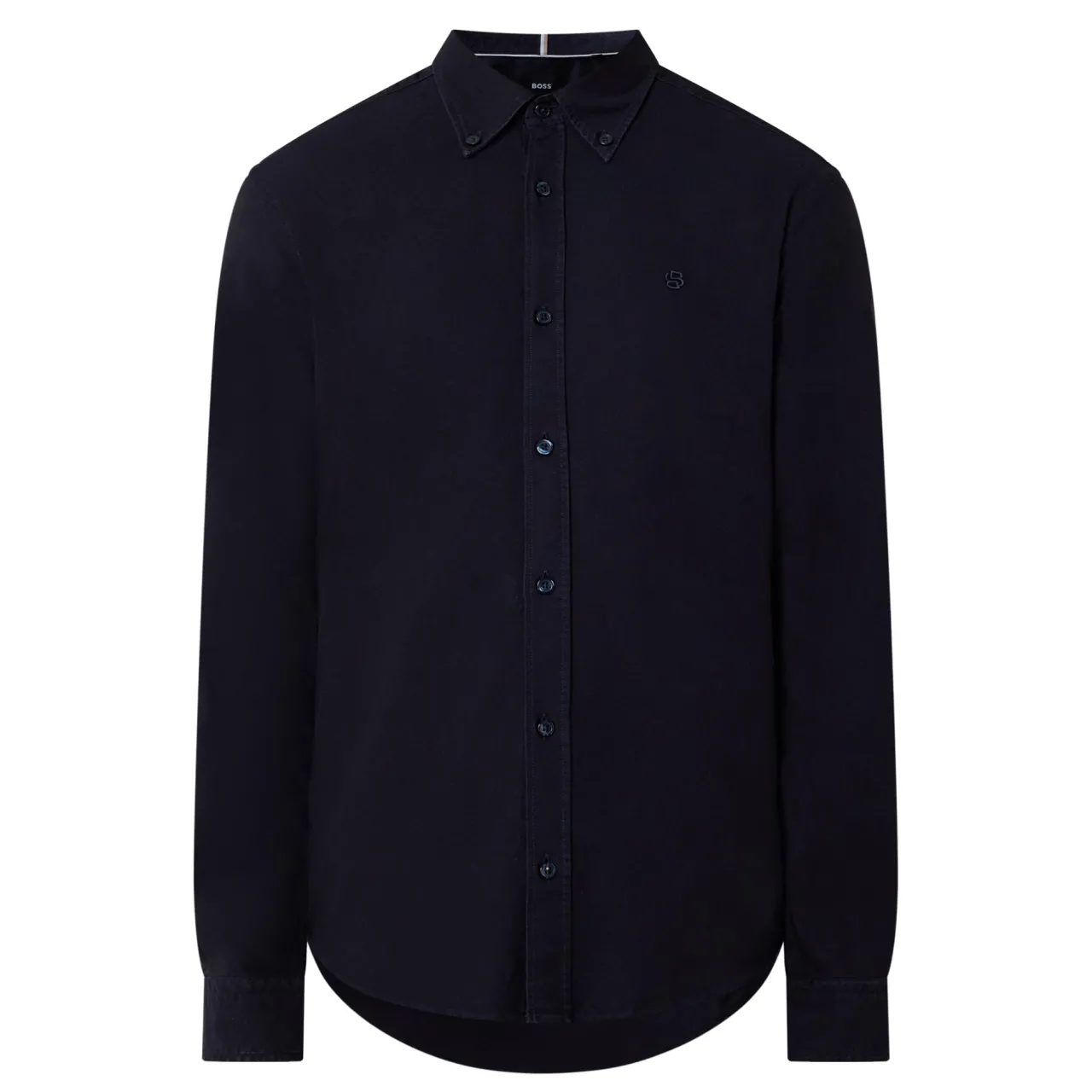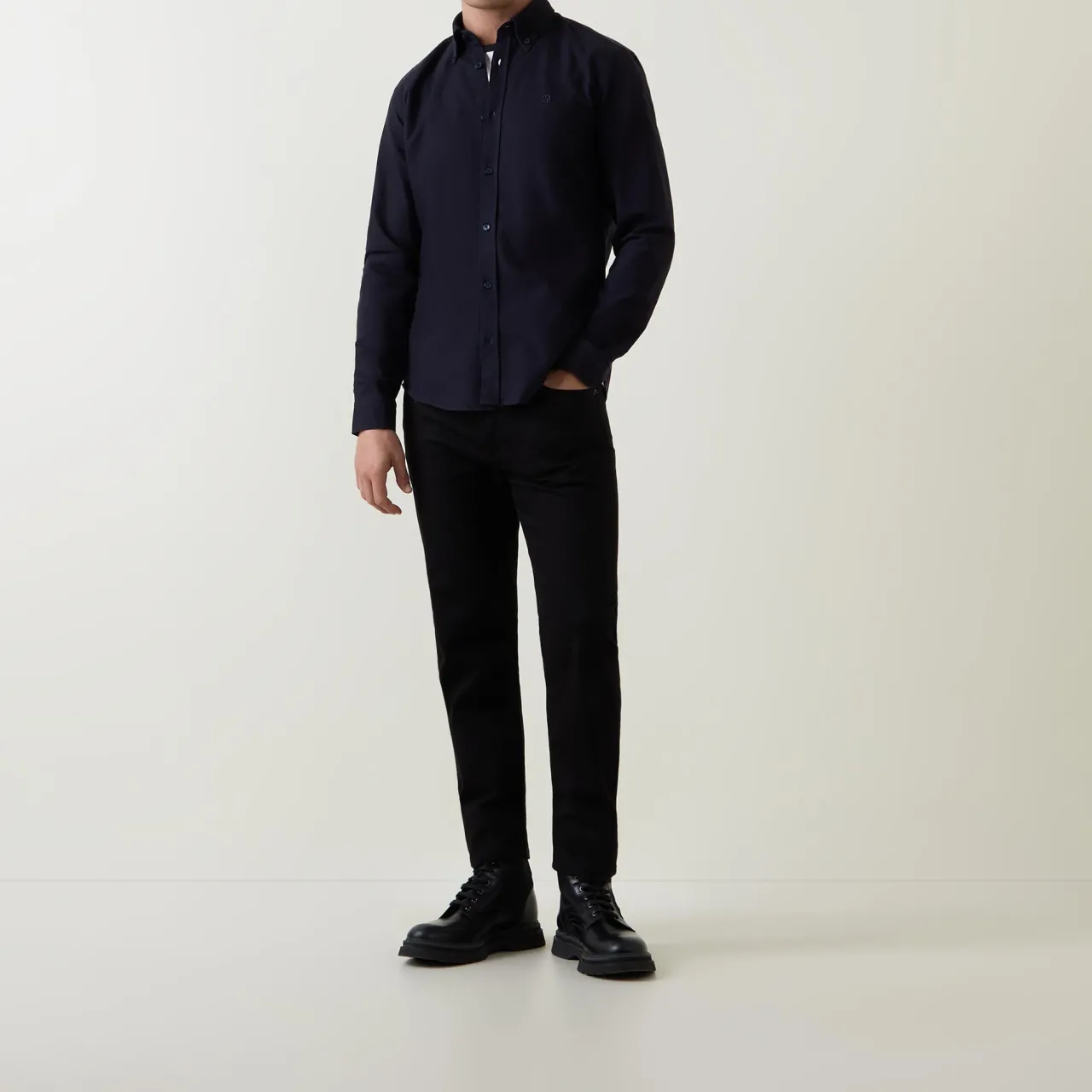 - Button-down collar, long sleeves, front button placket, logo detail on chest, single-button cuffs, tonal stitching, curved hemline, smooth fabric
