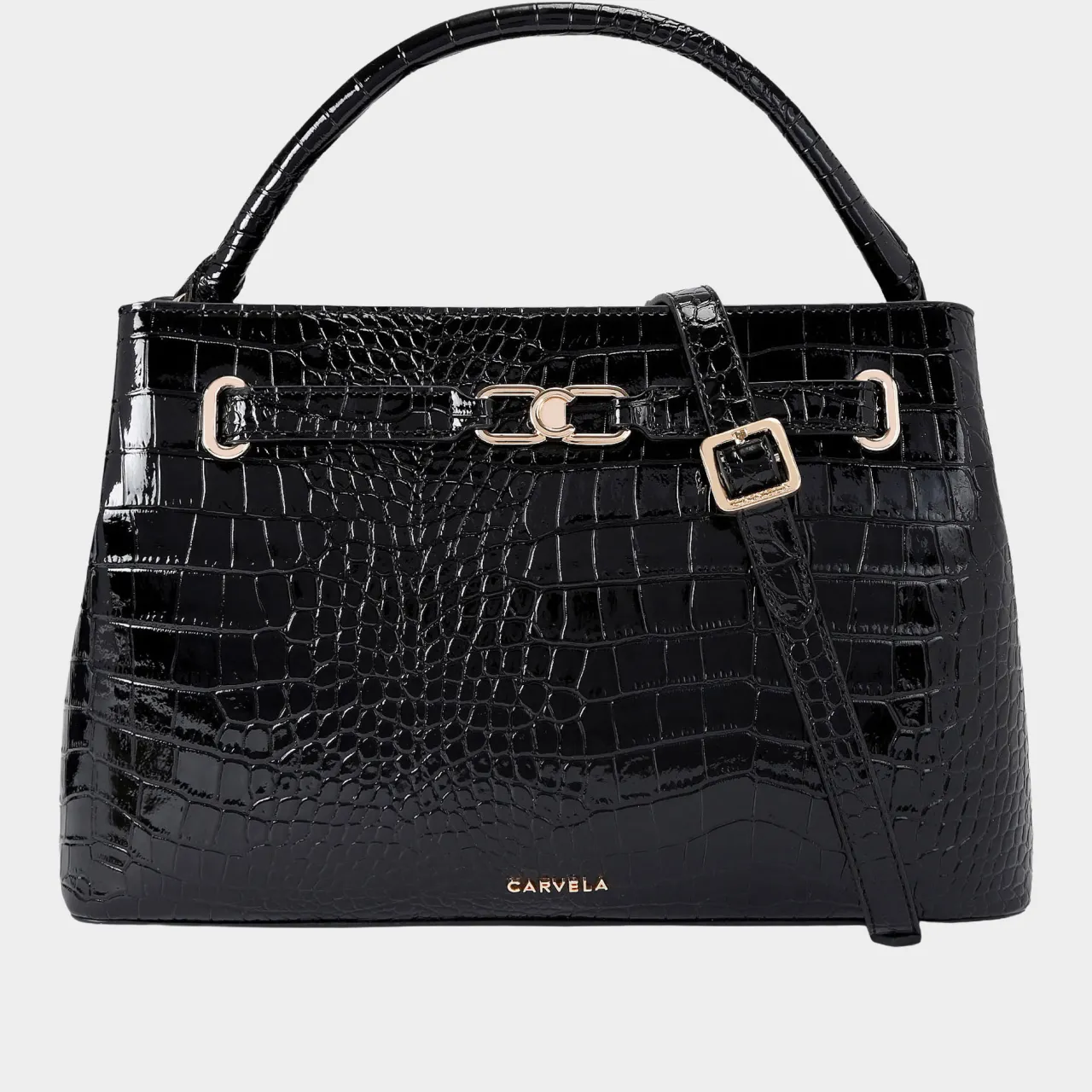 - Large tote silhouette, patent croc-embossed leather alternative, top handle, gold C plate branding