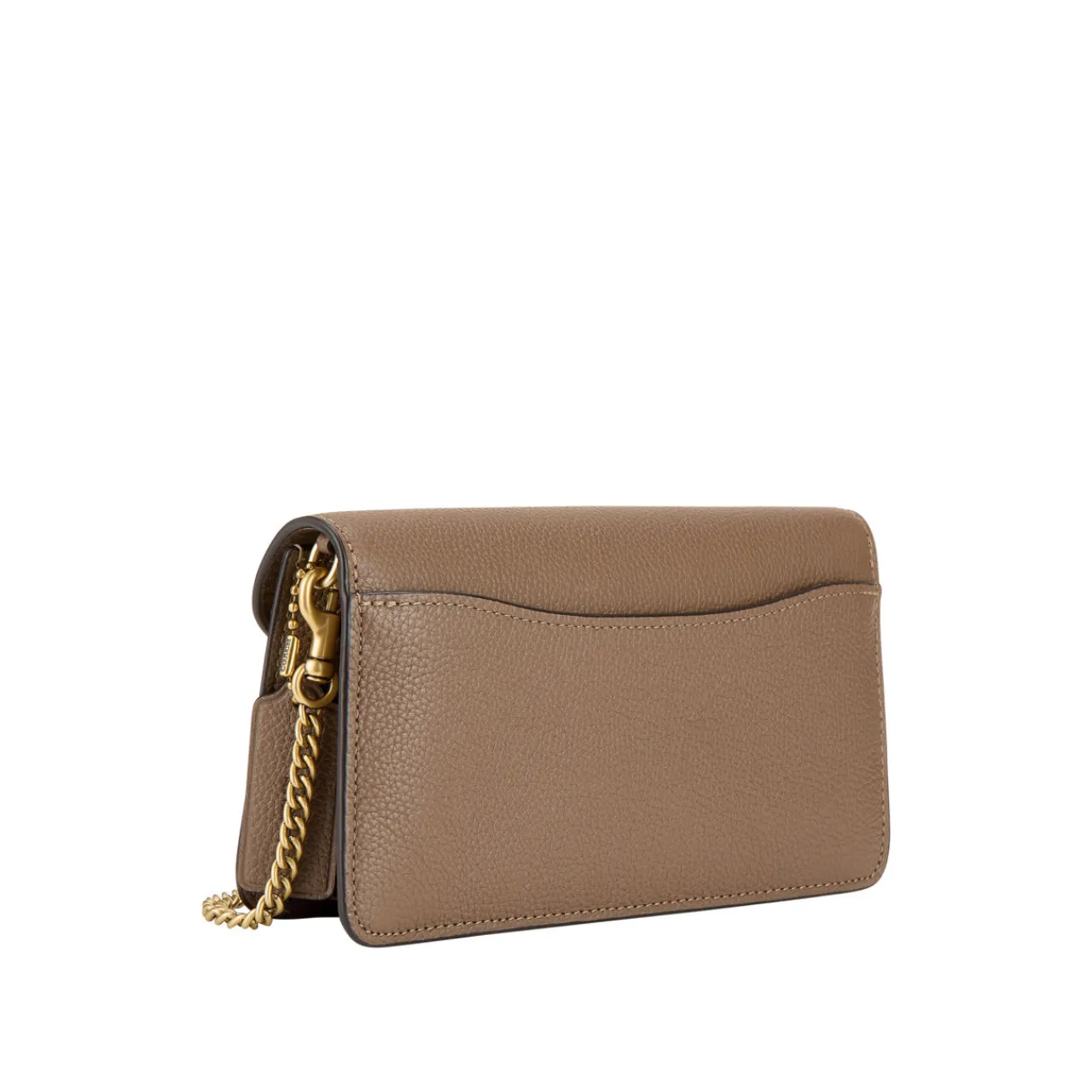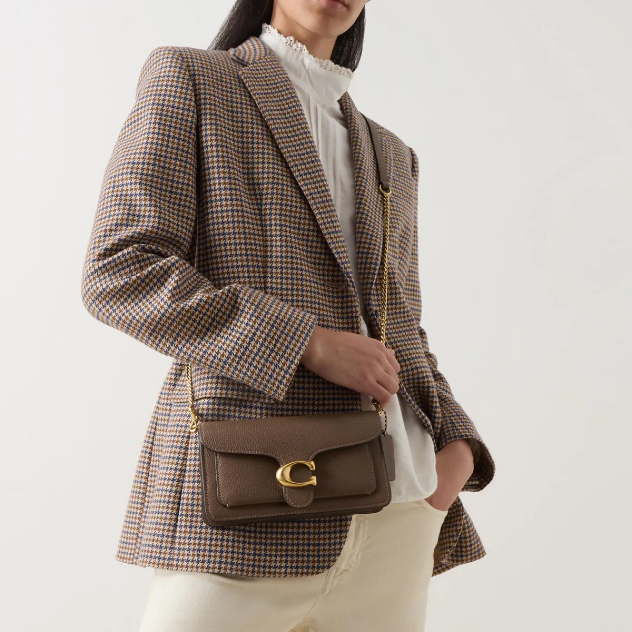 - Flap fastening with magnetic button closure, gold-toned hardware, pebbled finish, detachable chain strap, tonal C logo and branded tag details