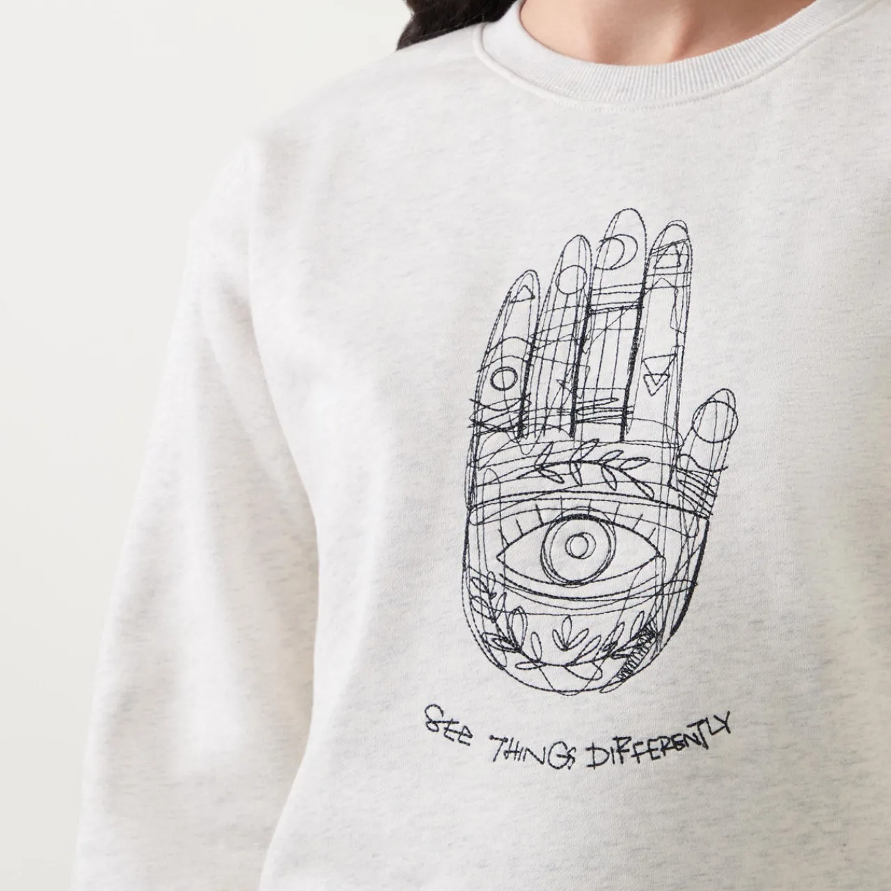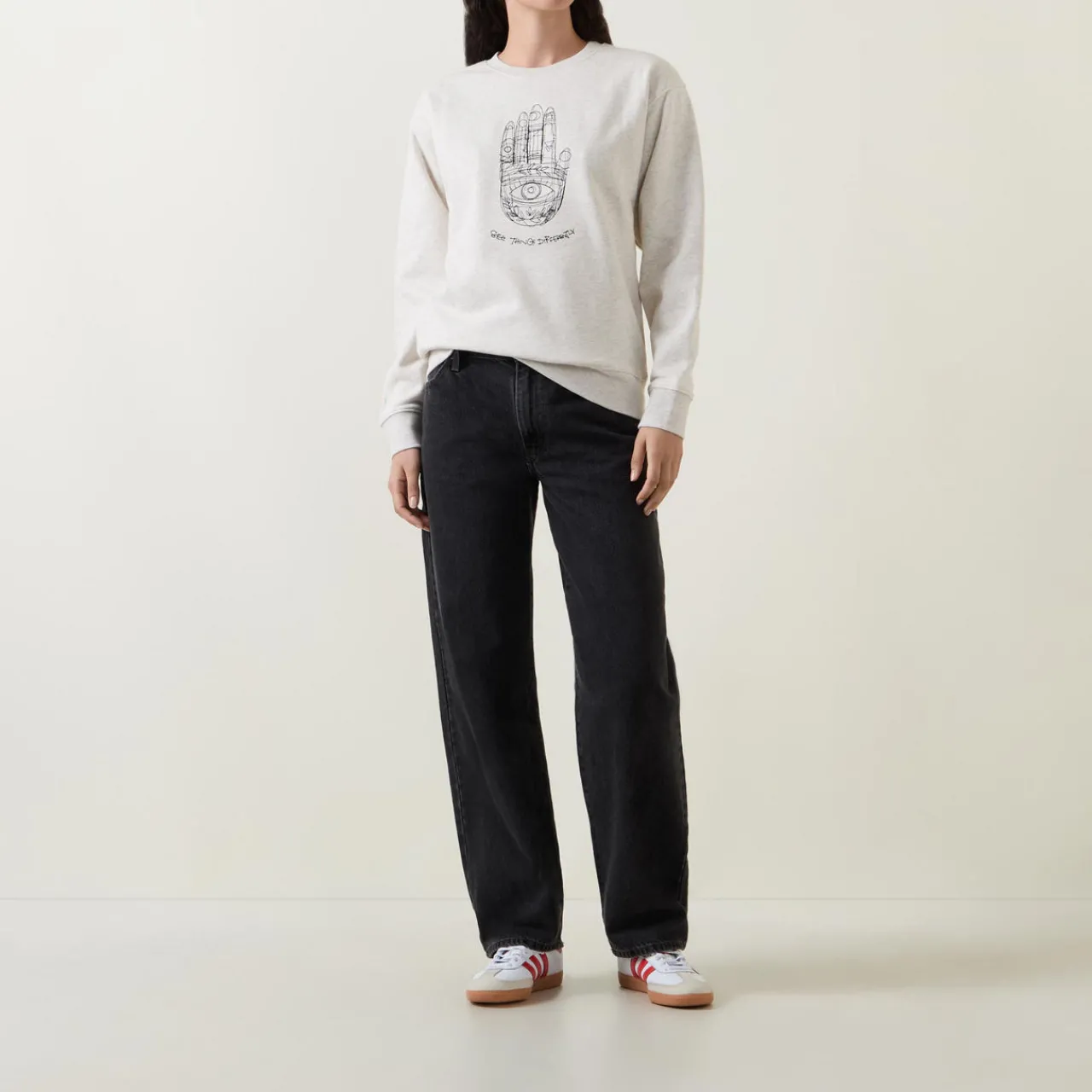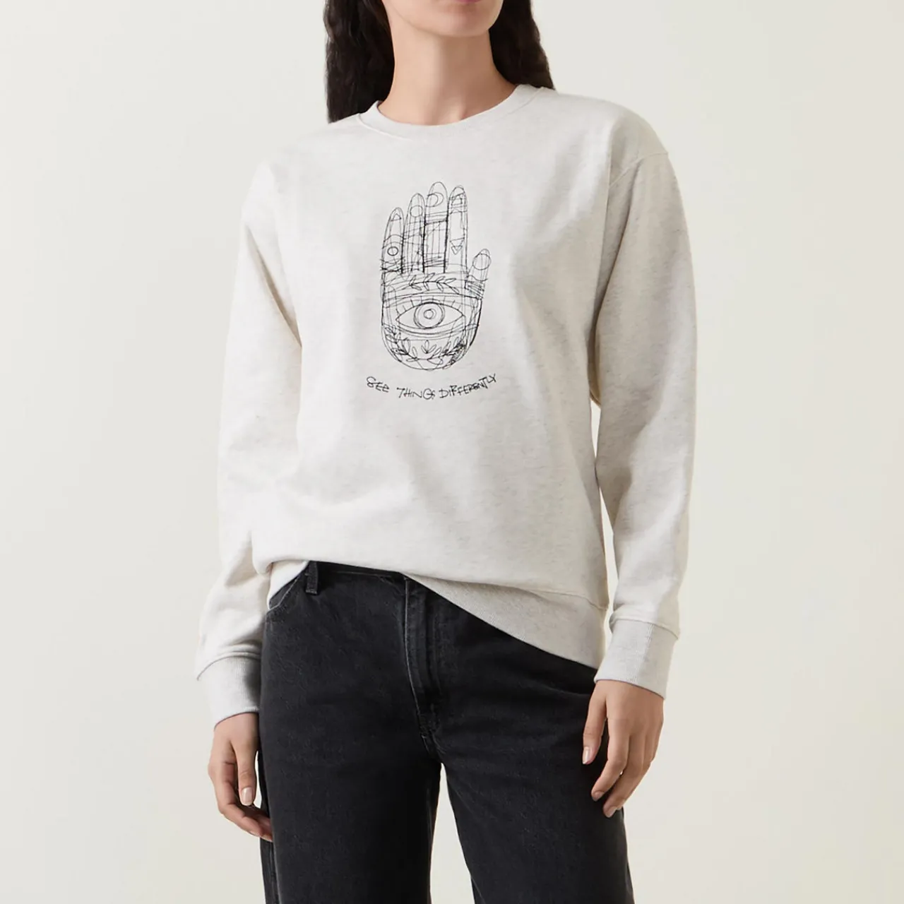 - Graphic print, crew neckline, long sleeves, ribbed trims, straight hemline