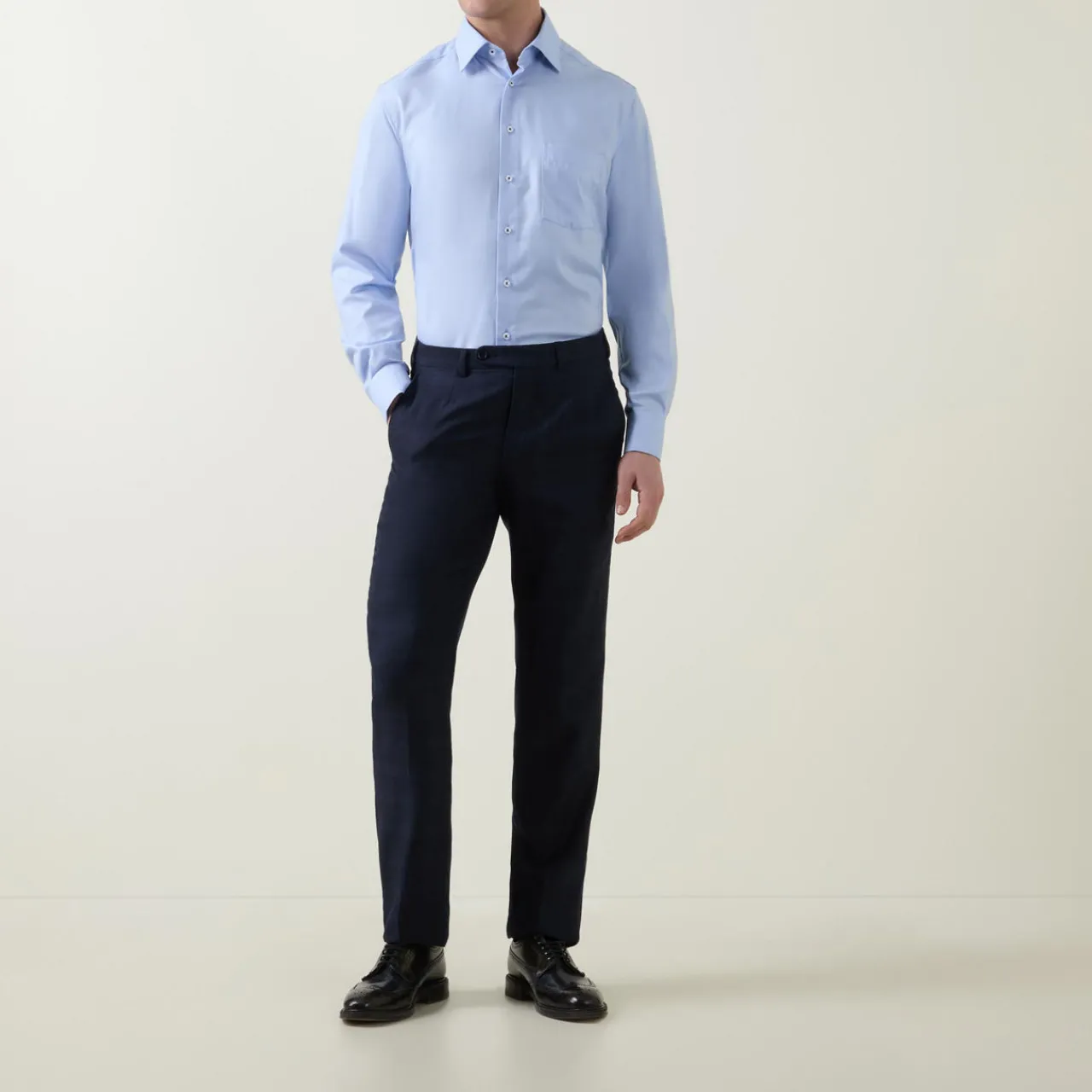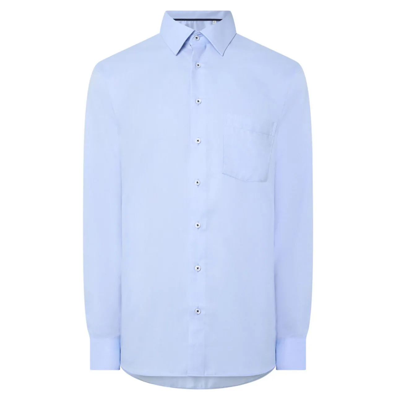 - Pointed collar, long sleeves, button placket, chest pocket, tonal stitching, single-button cuffs, curved hemline, smooth fabric