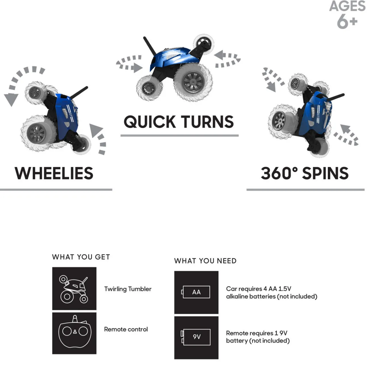 - Wireless remote control toy, 360 degree spinning car, LED lights
