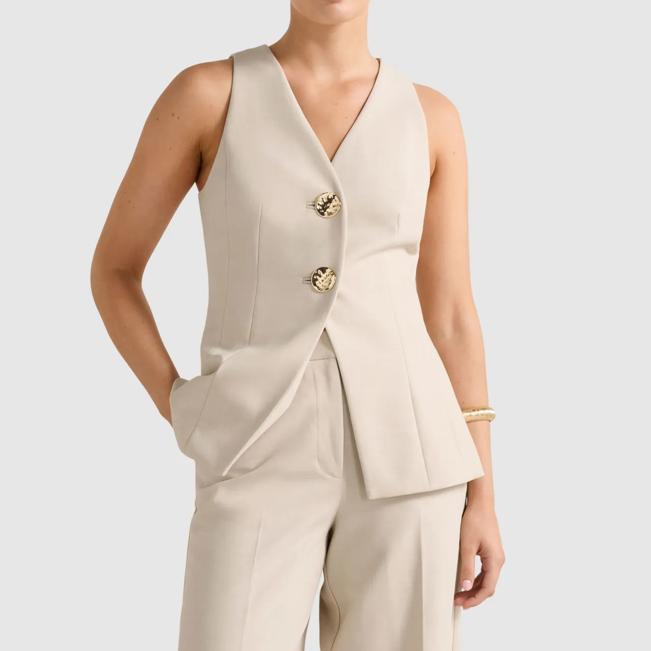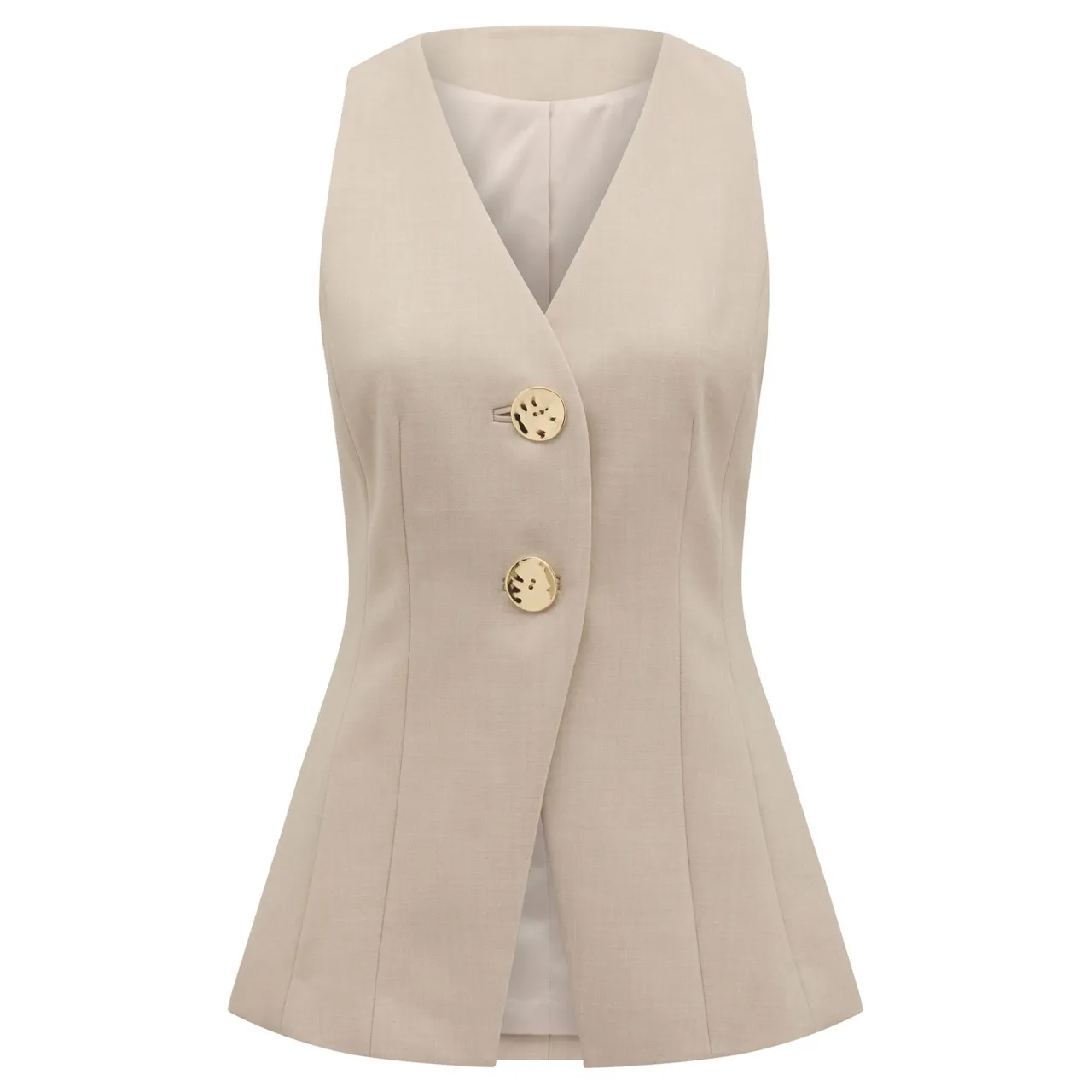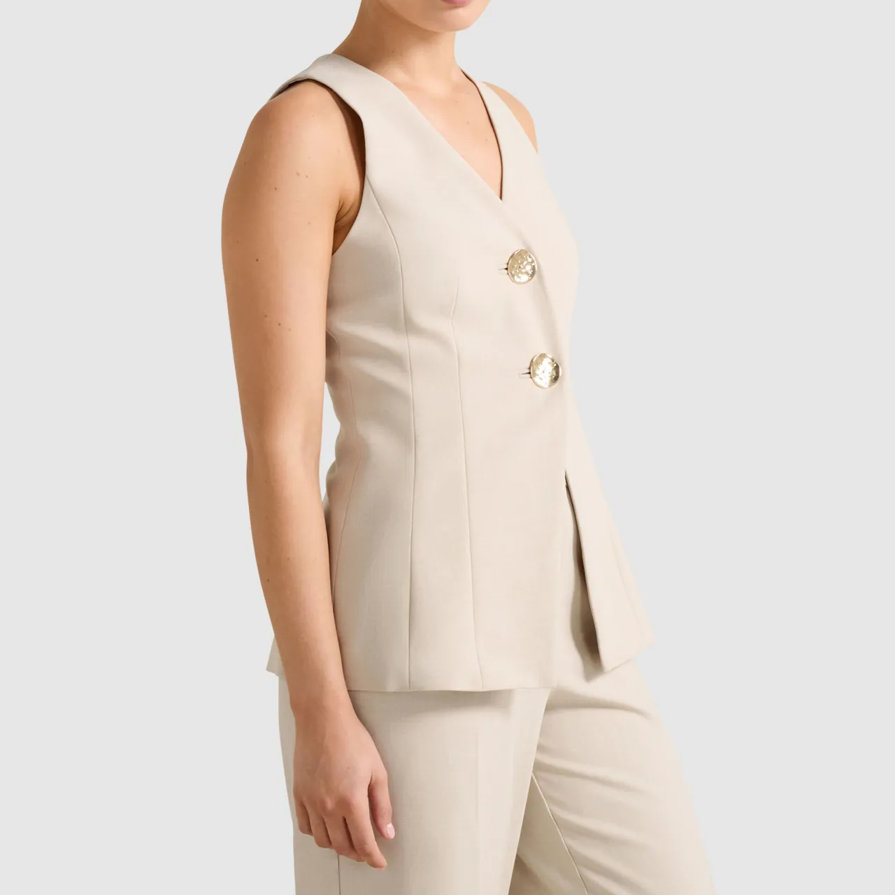 - Longline, woven blend fabrication, V-neckline, sleeveless design, large gold-tone buttons, vertical seams