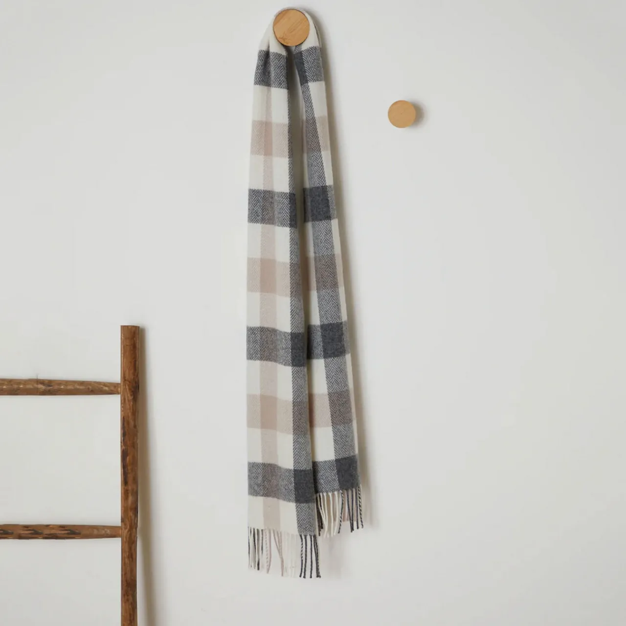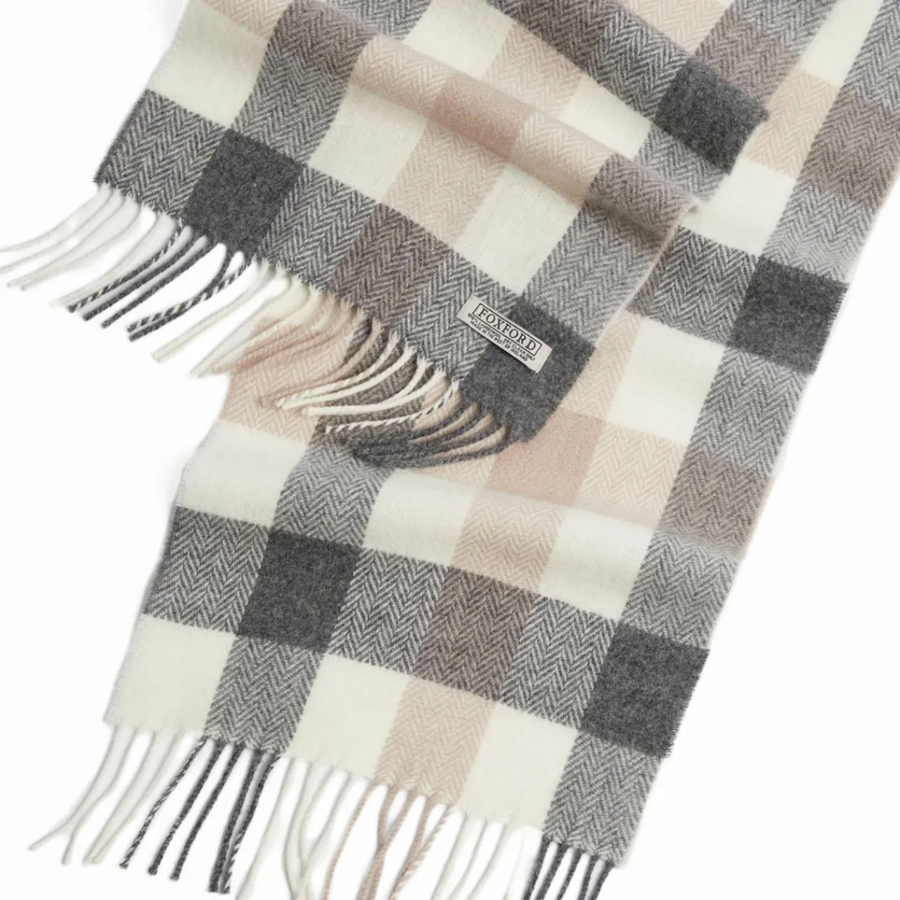 - Wrap-around style, block check print pattern, fringed edges, logo tag, soft finish