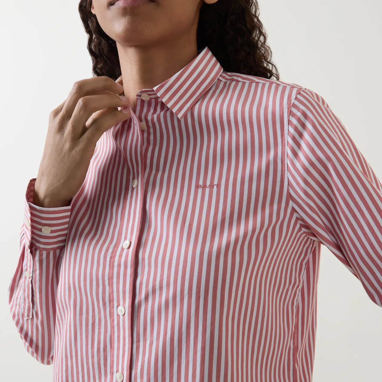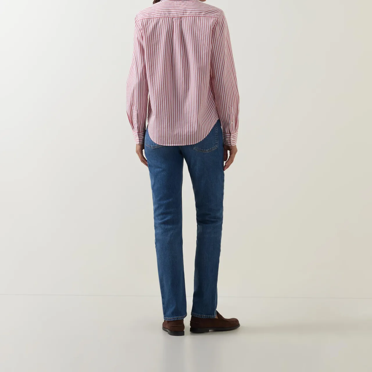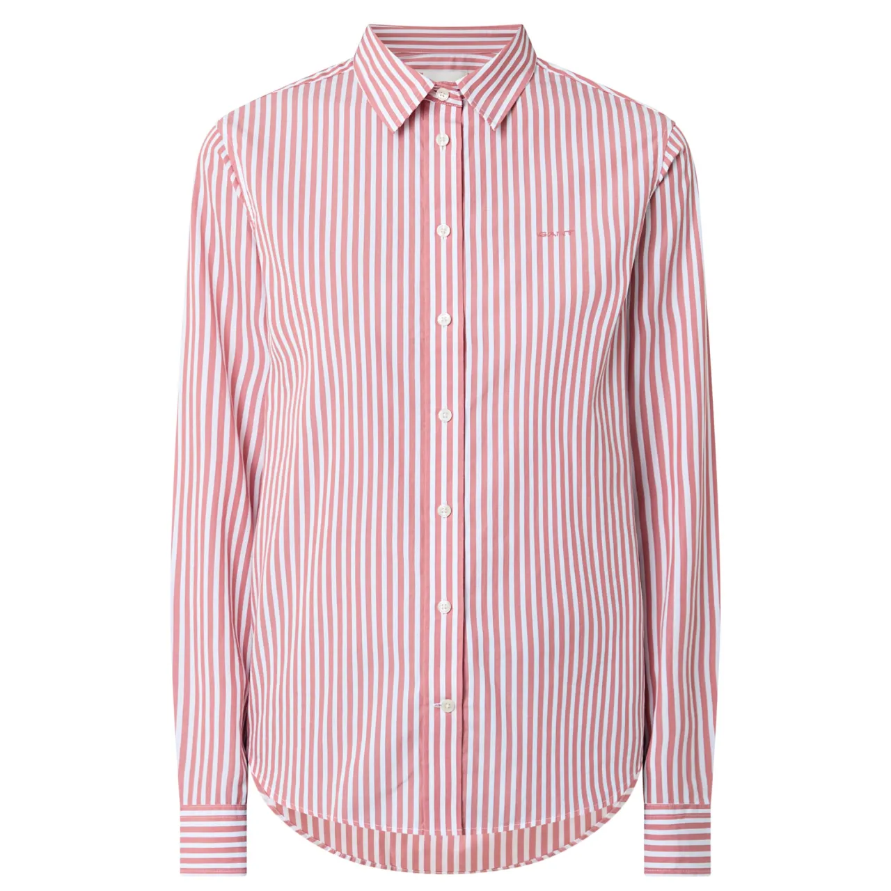 - Pointed collar, button fastening, long sleeves, single-cuff, curved hemline, stripe pattern, embroidered logo detail, box pleat and locker loop at back