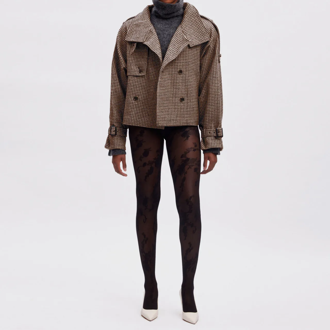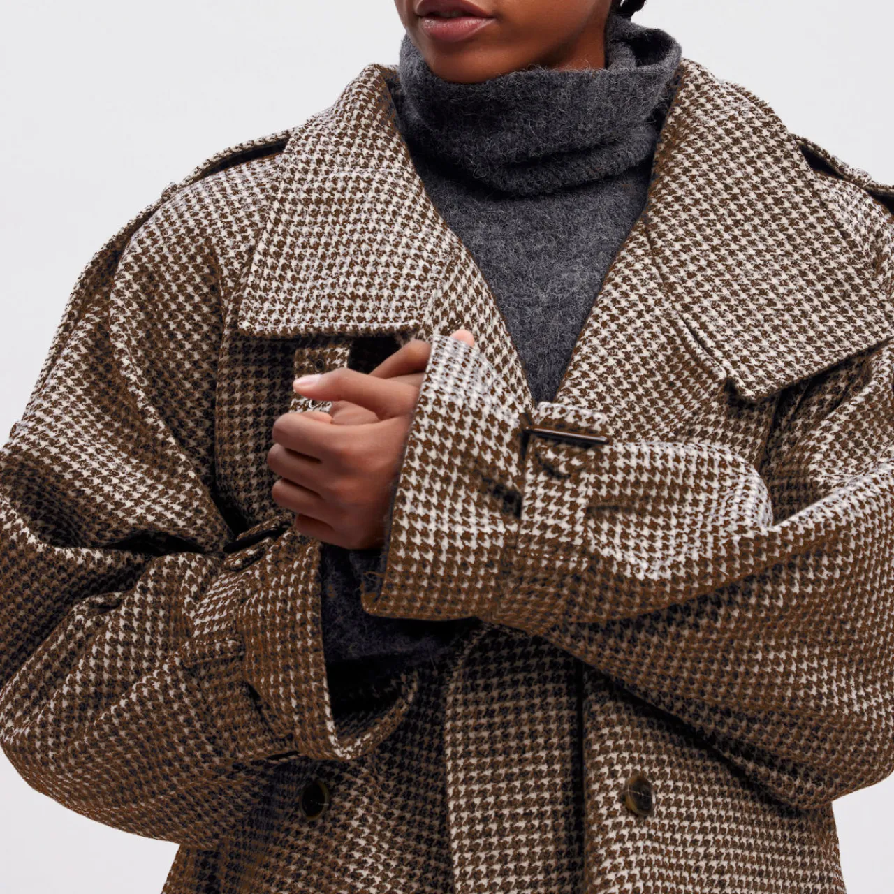 - Short, double-breasted, two-way collar, buckle fastening, boxy silhouette, front buttoned gun flap, rear gun flap, slanted front pockets, long raglan sleeves, buttoned shoulder tabs, adjustable sleeve tabs, houndstooth design