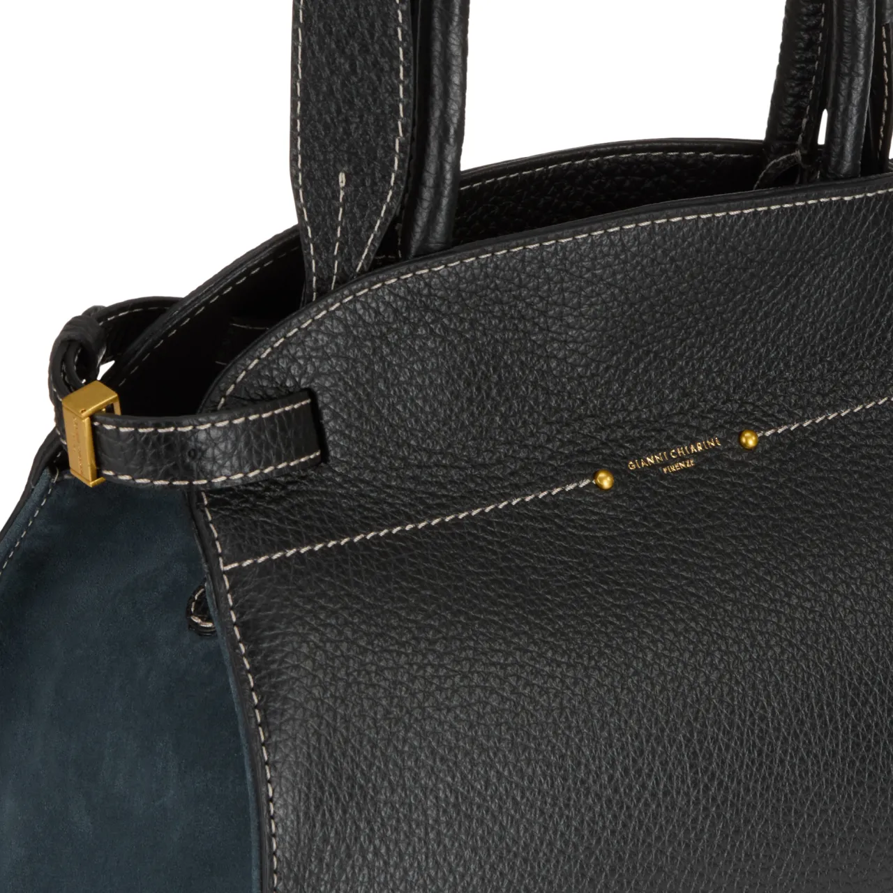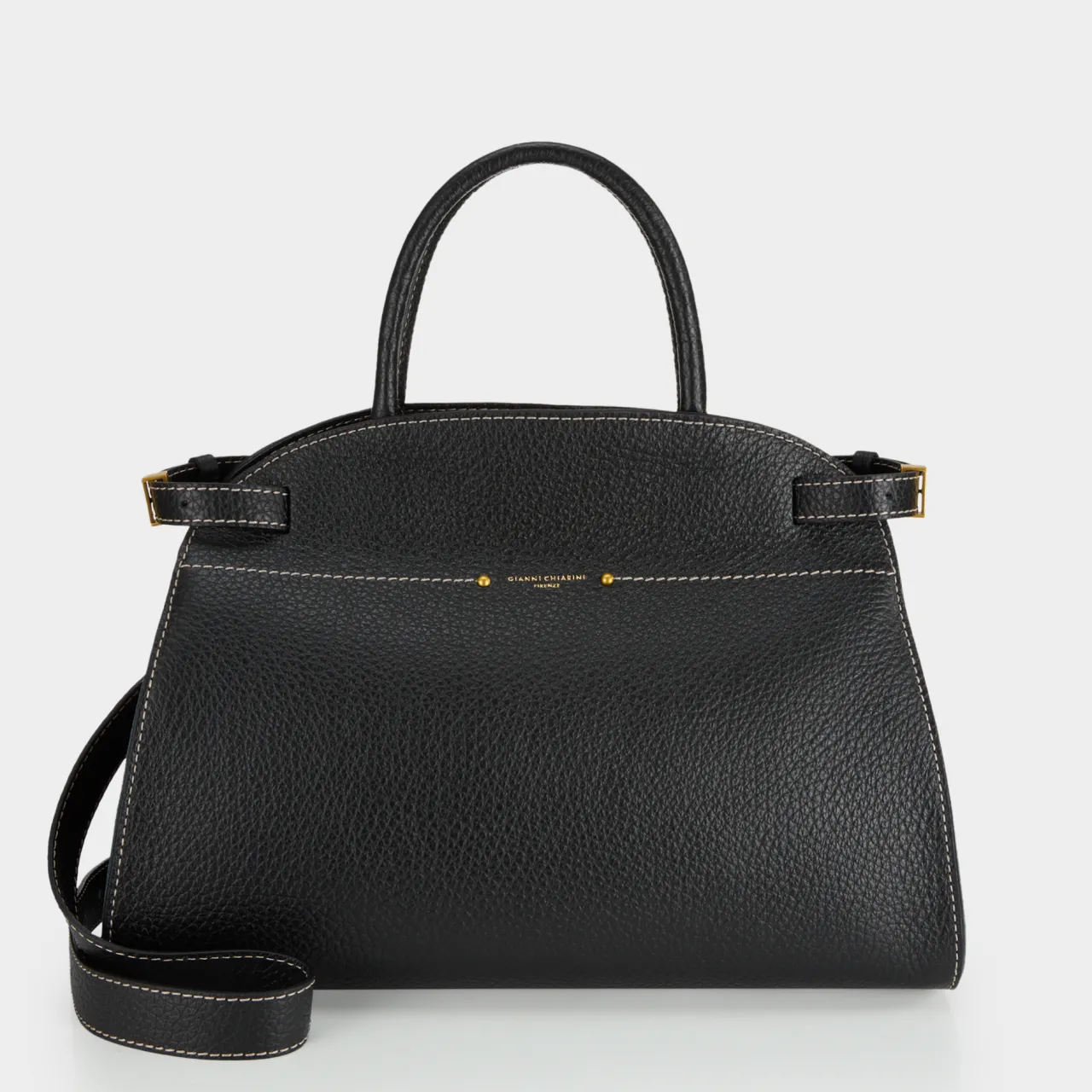 - Top carry handles, magnetic button closure, detachable crossbody strap, buckle and strap detailing, contrast top-stitch embellishment, foil logo print, grained finish, gold-tone hardware