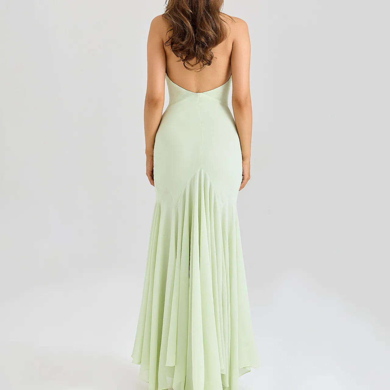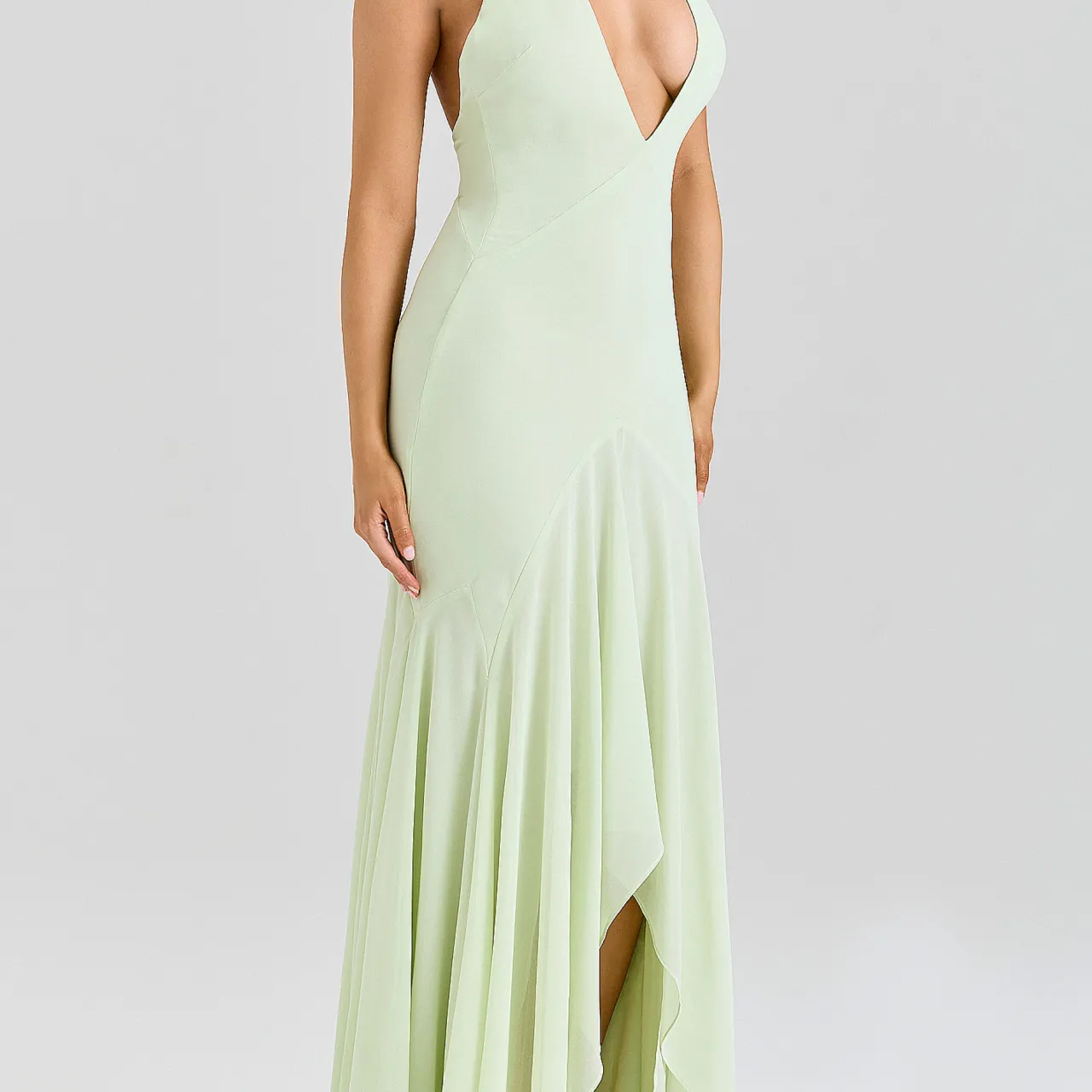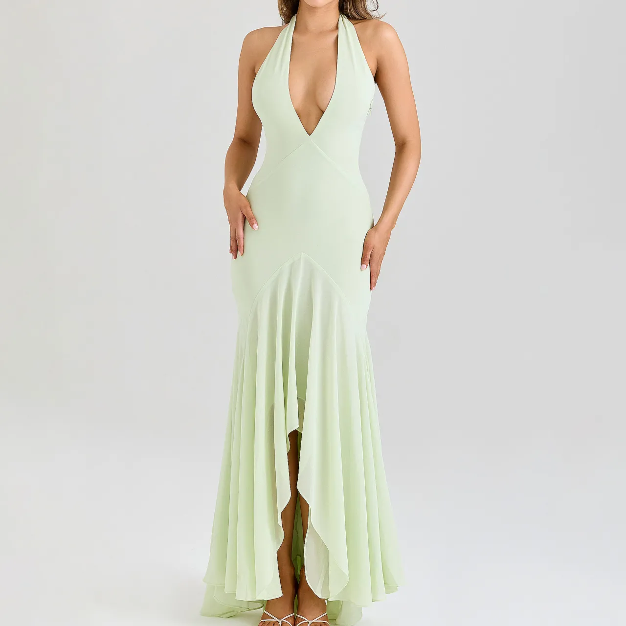 - Halter neck shaping, plunged neckline, exposed shoulders, side zip, draped georgette, asymmetric hem, soft pleats, cascading skirt