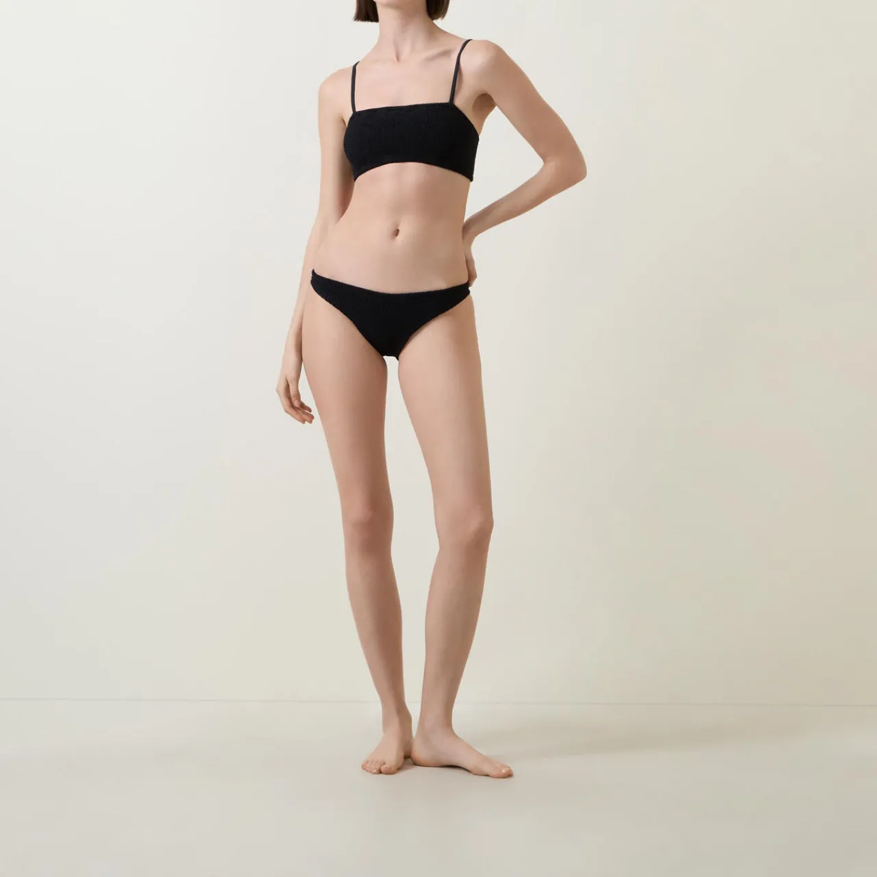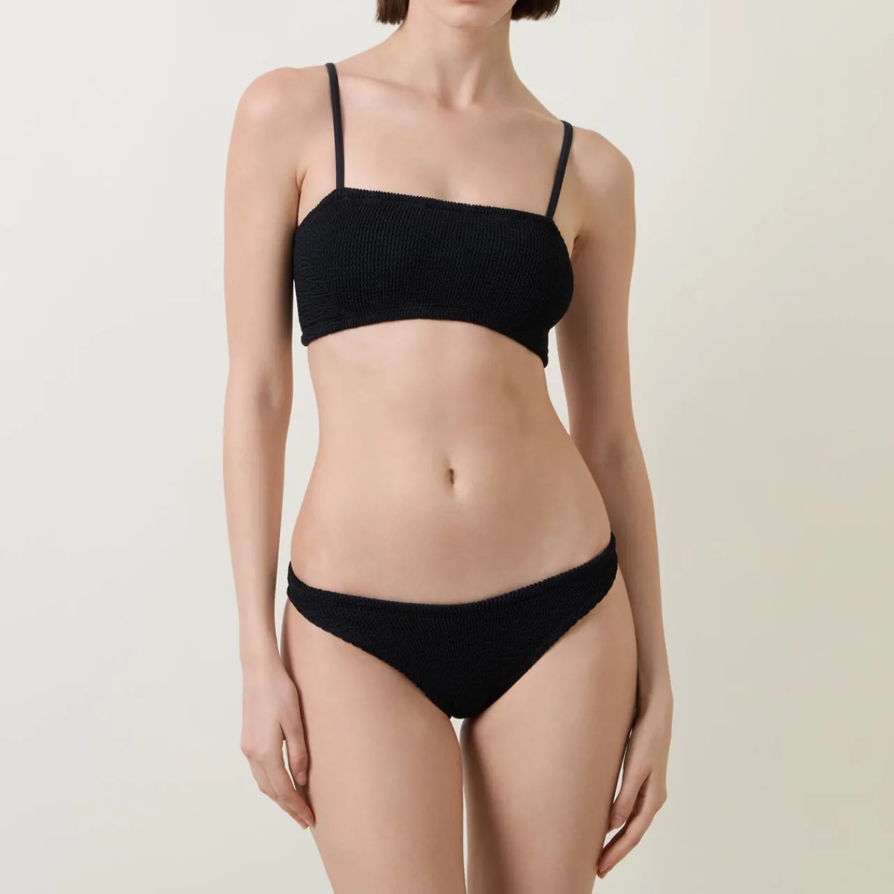 - Crinkle-effect, spaghetti straps, mid-rise waist.