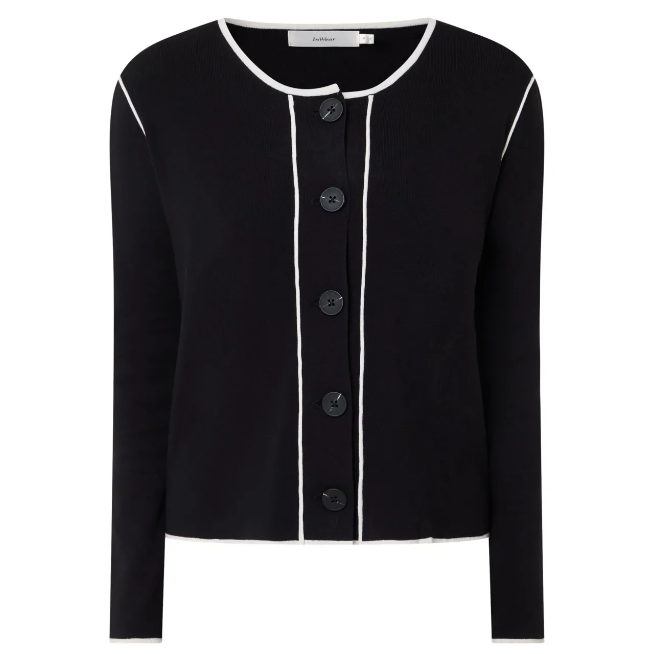 - Round neckline, long sleeves, contrast seams and trims, button fastening, knit structure